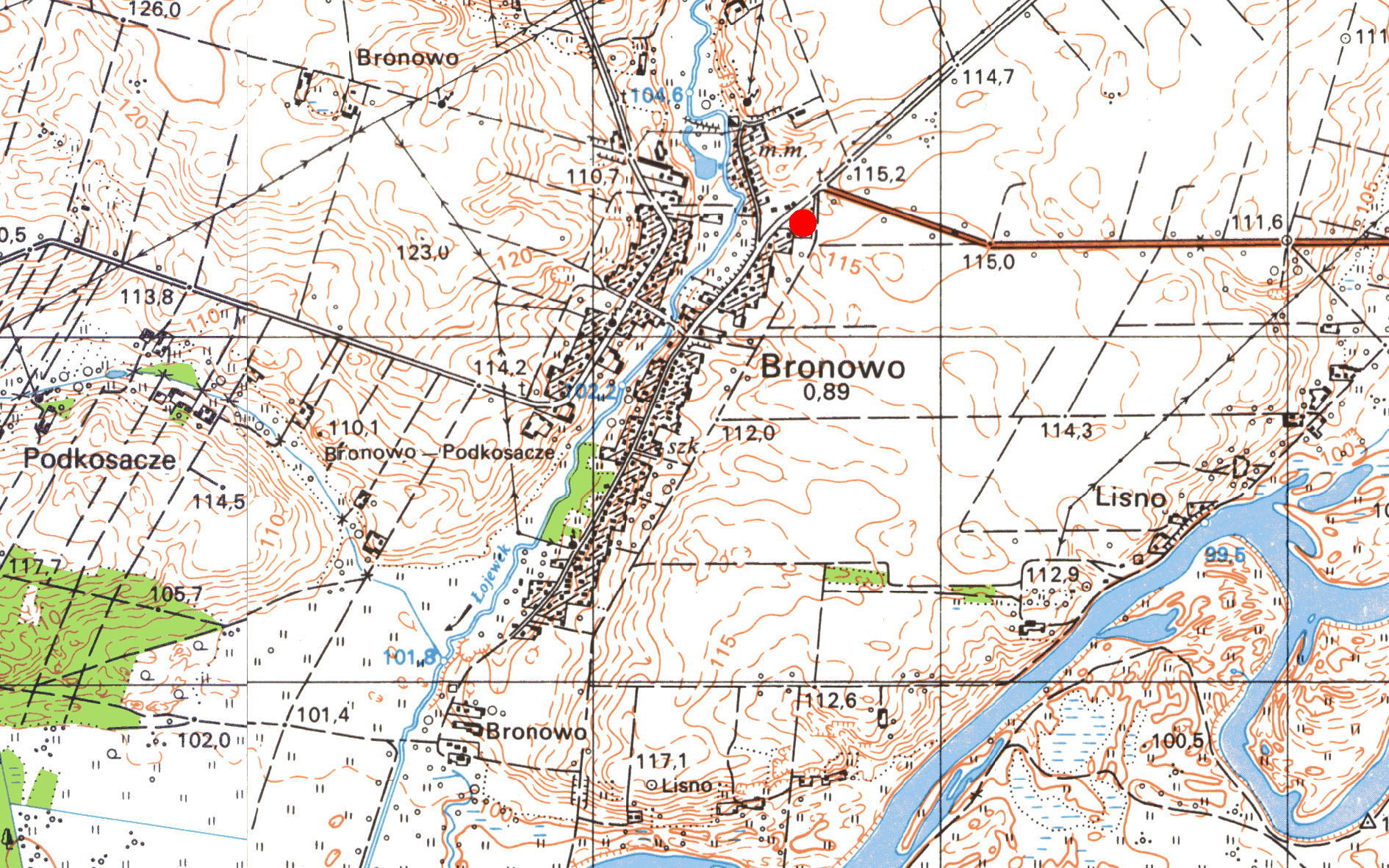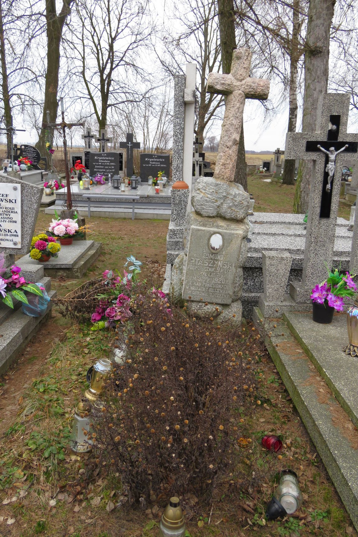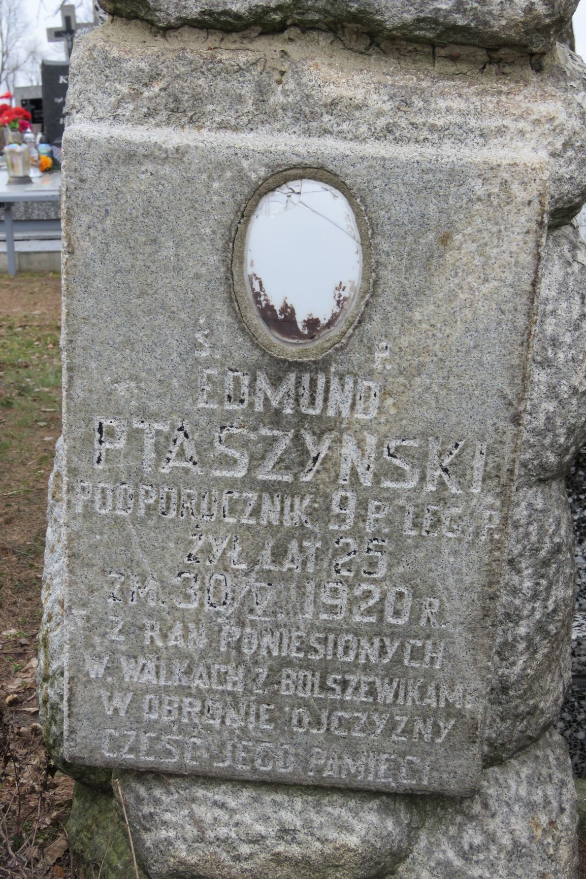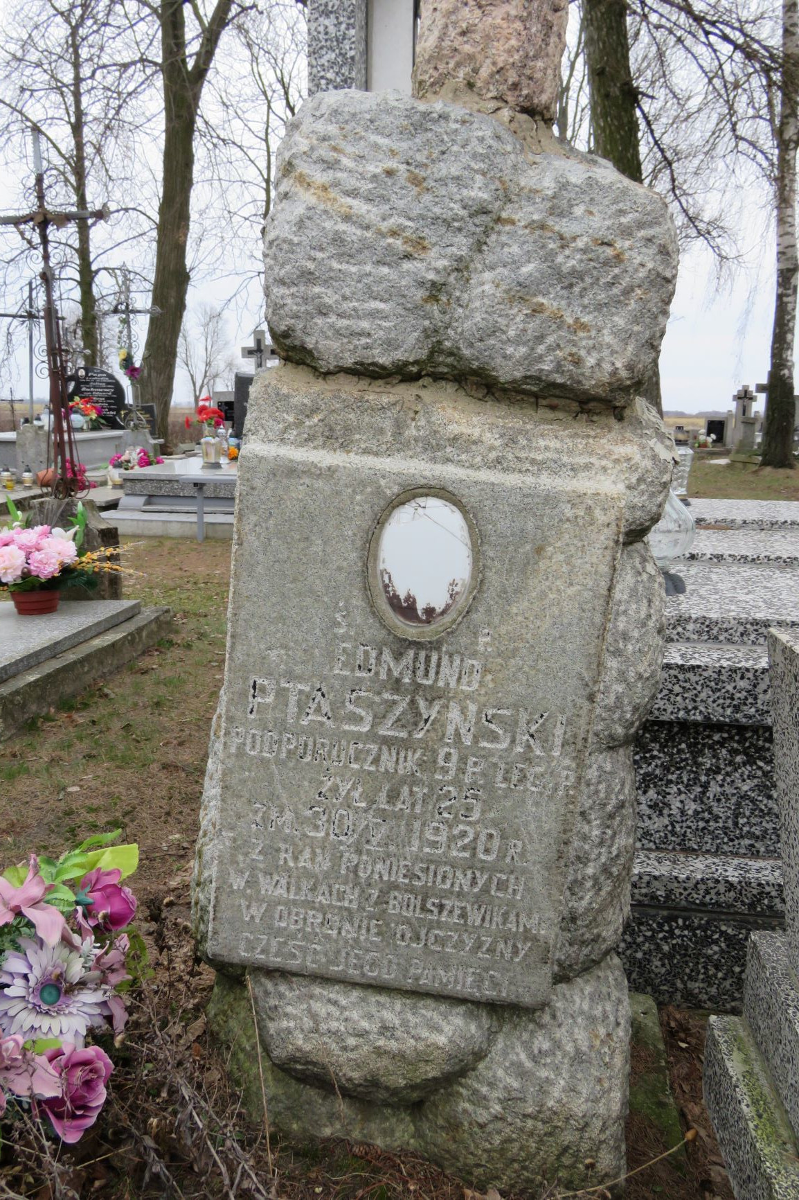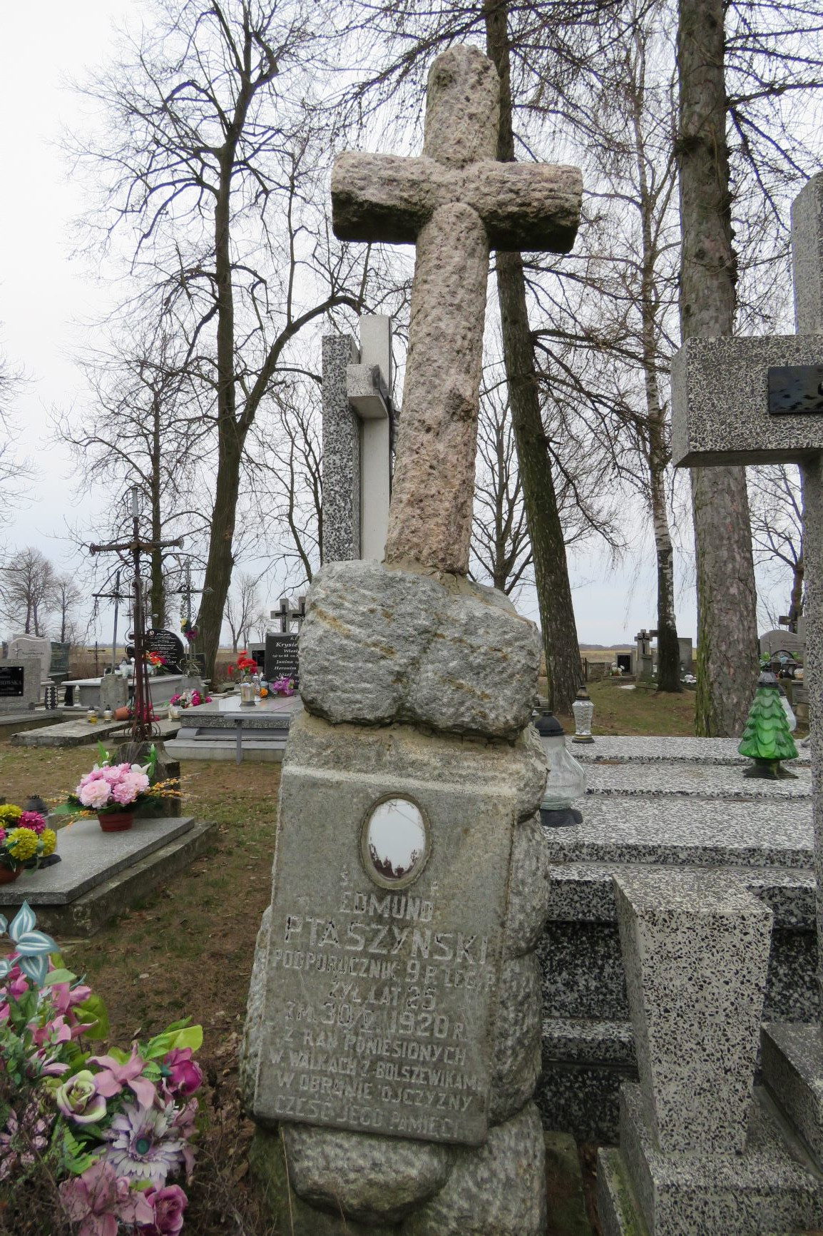 W centralnej części cmentarza parafialnego, na północny wschód od głównej alei znajduje się grób podporucznika Edmunda Ptaszyńskiego z 9. Pułku Legionów Polskich . Ziemną mogiłę bez obramowania oznakowano w latach 20.-30. XX w. kamiennym nagrobkiem w formie nieregularnego, czworościennego, kamiennego cokołu, stylizowanego na postument murowany z kamieni polnych, zwieńczonego granitowym krzyżem, stylizowanym na drewniany krzyż. Na froncie cokołu znajduje się płyta epitafijna z fotografią poległego, obecnie nieczytelną oraz umieszczoną poniżej inskrypcją: EDMUND / PTASZYŃSKI / PODPORUCZNIK 9. P. LEG. P. / ŻYŁ LAT 25 / ZM. 30.VIII 1920 R. / Z RAN PONIESIONYCH / W WALKACH Z BOLSZEWIKAMI / W OBRONIE OJCZYZNY / CZEŚĆ JEGO PAMIĘCI O mogiłę i pamięć poległego dbają mieszkańcy Bronowa. Brak śladów i informacji świadczących o opiece instytucjonalnej. Źródło: Małgorzata Karczewska, Maciej Karczewski, Miejsca pamięci czynu niepodległościowego na północno-wschodnim Mazowszu, Białystok 2019. Fot. © Małgorzata Karczewska