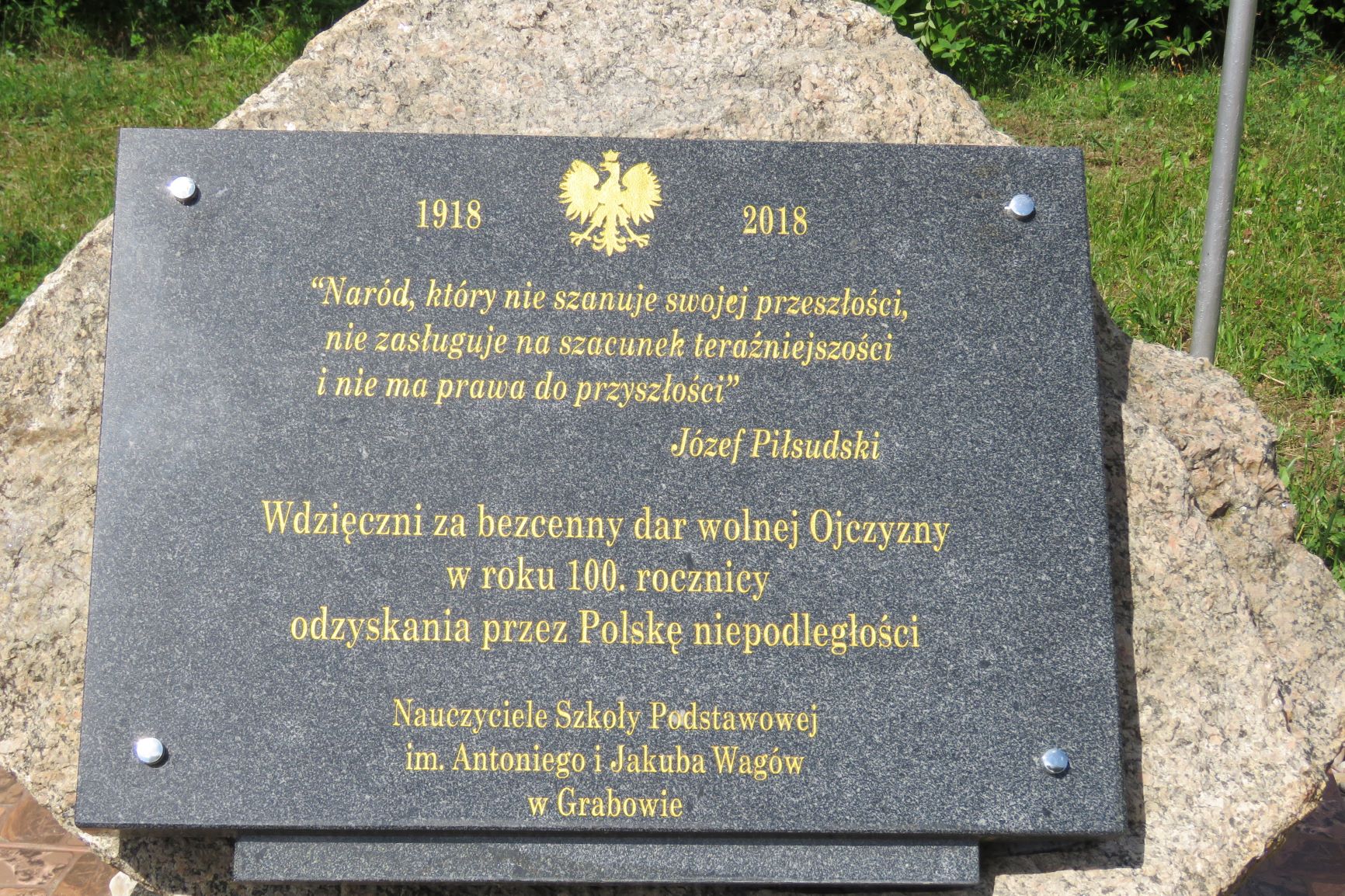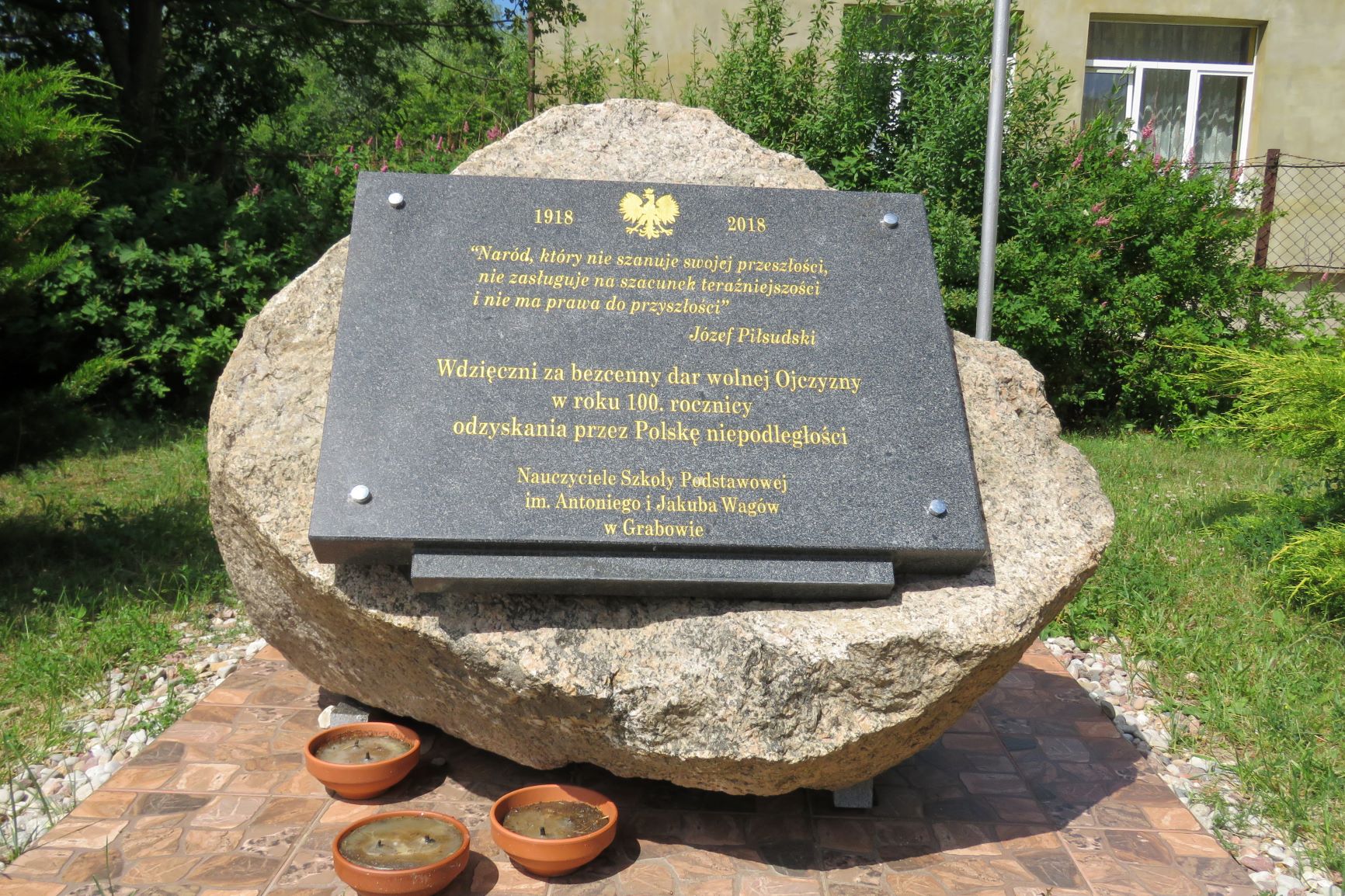 W stulecie odzyskania przez Polskę niepodległości, nauczyciele szkoły w Grabowie, podtrzymując tradycję patriotyczną swojego środowiska, ufundowali pomnik, który stanął na dziedzińcu szkolnym. Jest to obelisk w formie głazu granitowego, z pamiątkową płytą z inskrypcją: 1918 2018 „Naród, który nie szanuje swojej przeszłości, / nie zasługuje na szacunek teraźniejszości / i nie ma prawa do przyszłości” / Józef Piłsudski Wdzięczni za bezcenny dar wolnej Ojczyzny / w roku 100. Rocznicy / odzyskania przez Polskę niepodległości / Nauczyciele Szkoły Podstawowej / im. Antoniego i Jakuba Wagów / w Grabowie. Źródło: Małgorzata Karczewska, Maciej Karczewski, Miejsca pamięci czynu niepodległościowego na północno-wschodnim Mazowszu, Białystok 2019. Fot. © Małgorzata Karczewska