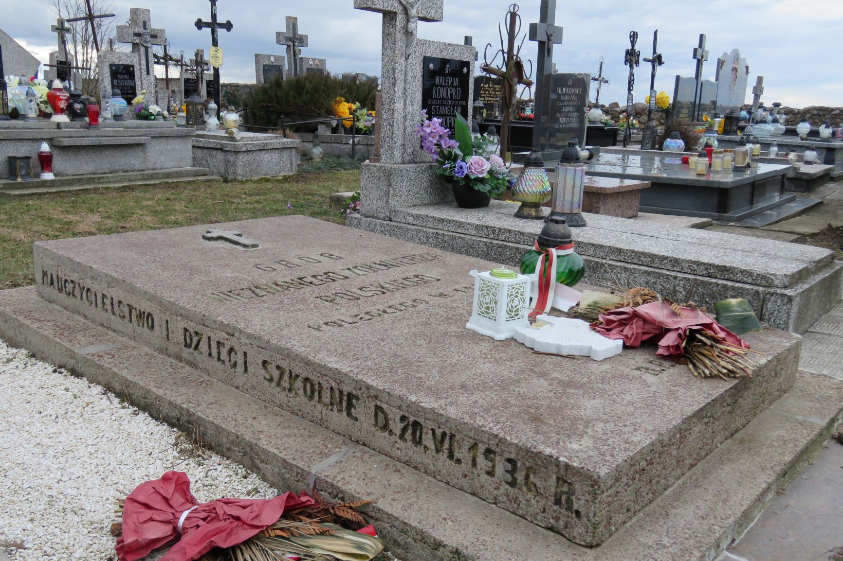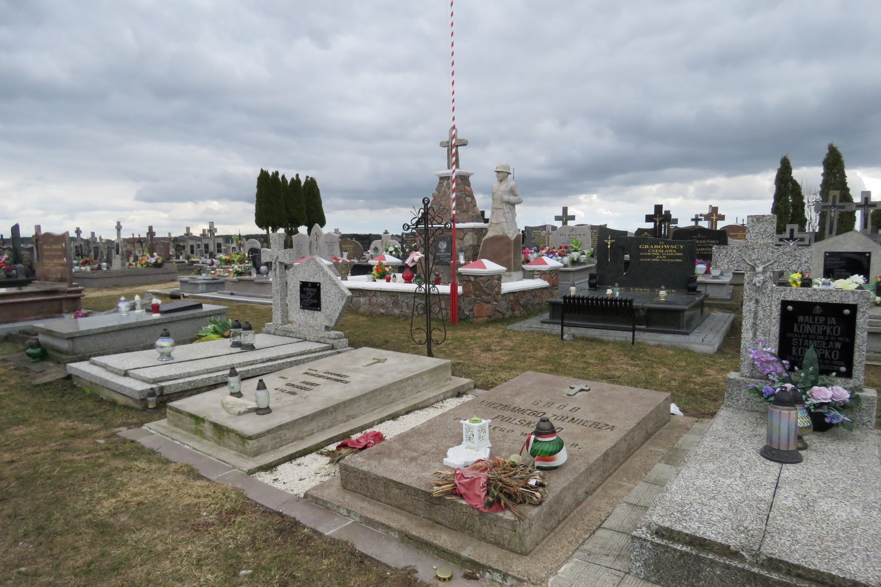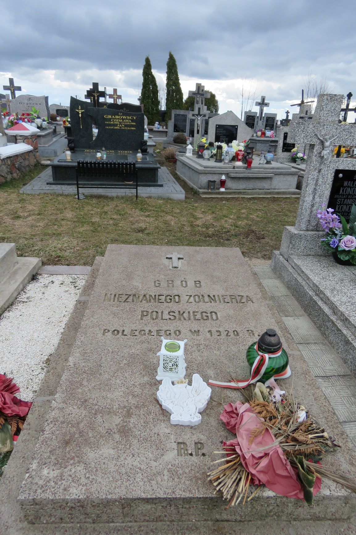 W południowej części cmentarza parafialnego znajduje się strefa mogił żołnierskich. Jedną z nich jest grób żołnierza polskiego poległego w 1920 r. Betonowe obramowanie i płyta nagrobna zostały ufundowane w 1936 r. przez społeczność miejscowej szkoły. Inskrypcja na płycie nagrobnej: GRÓB / NIEZNANEGO ŻOŁNIERZA / POLSKIEGO / POLEGŁEGO W 1920 R. Na bocznej ścianie obramowania mogiły: NAUCZYCIELSTWO I DZIECI SZKOLNE D. 20.VI.1936 R. W wykazie strat Wojska Polskiego z lat 1918-1920 znajduje się nazwisko Pawła Ginzburga, szeregowego 2. Syberyjskiego Pułku Piechoty, poległego 24 VIII 1920 r. w Grabowie lub najbliższej okolicy . Być może to właśnie ten żołnierz spoczywa na grabowskim cmentarzu parafialnym. O groby żołnierskie dbają mieszkańcy wsi i samorząd. Podczas uroczystości związanych ze świętami państwowymi, w tym rocznicą odzyskania niepodległości, na mogiłach składane są kwiaty i zapalane znicze. Źródło: Małgorzata Karczewska, Maciej Karczewski, Miejsca pamięci czynu niepodległościowego na północno-wschodnim Mazowszu, Białystok 2019. Fot. © Małgorzata Karczewska