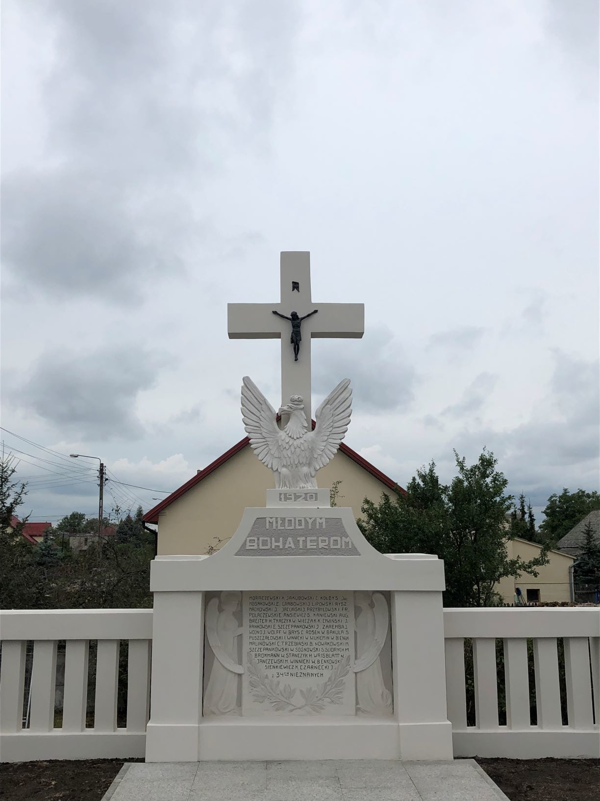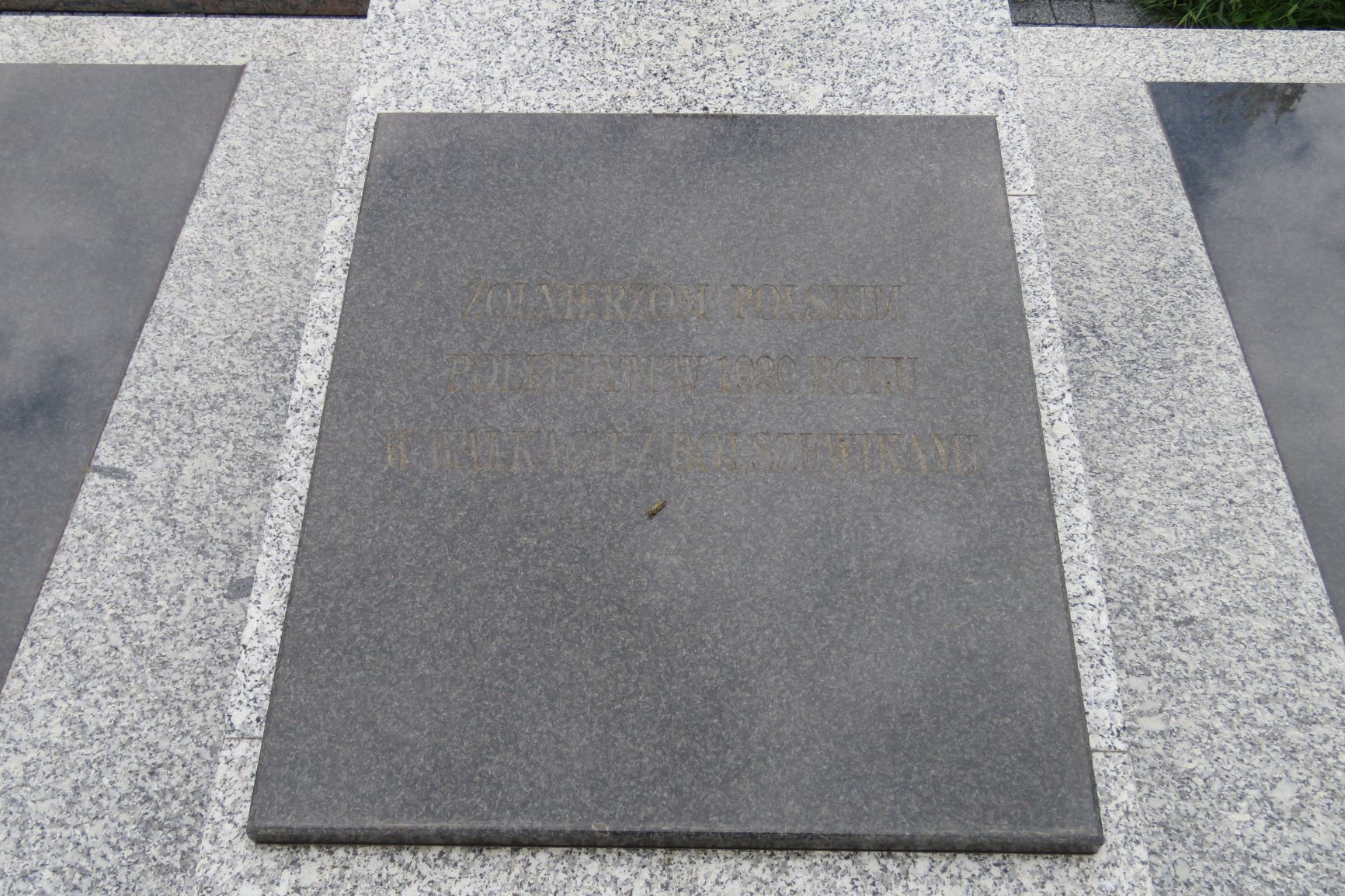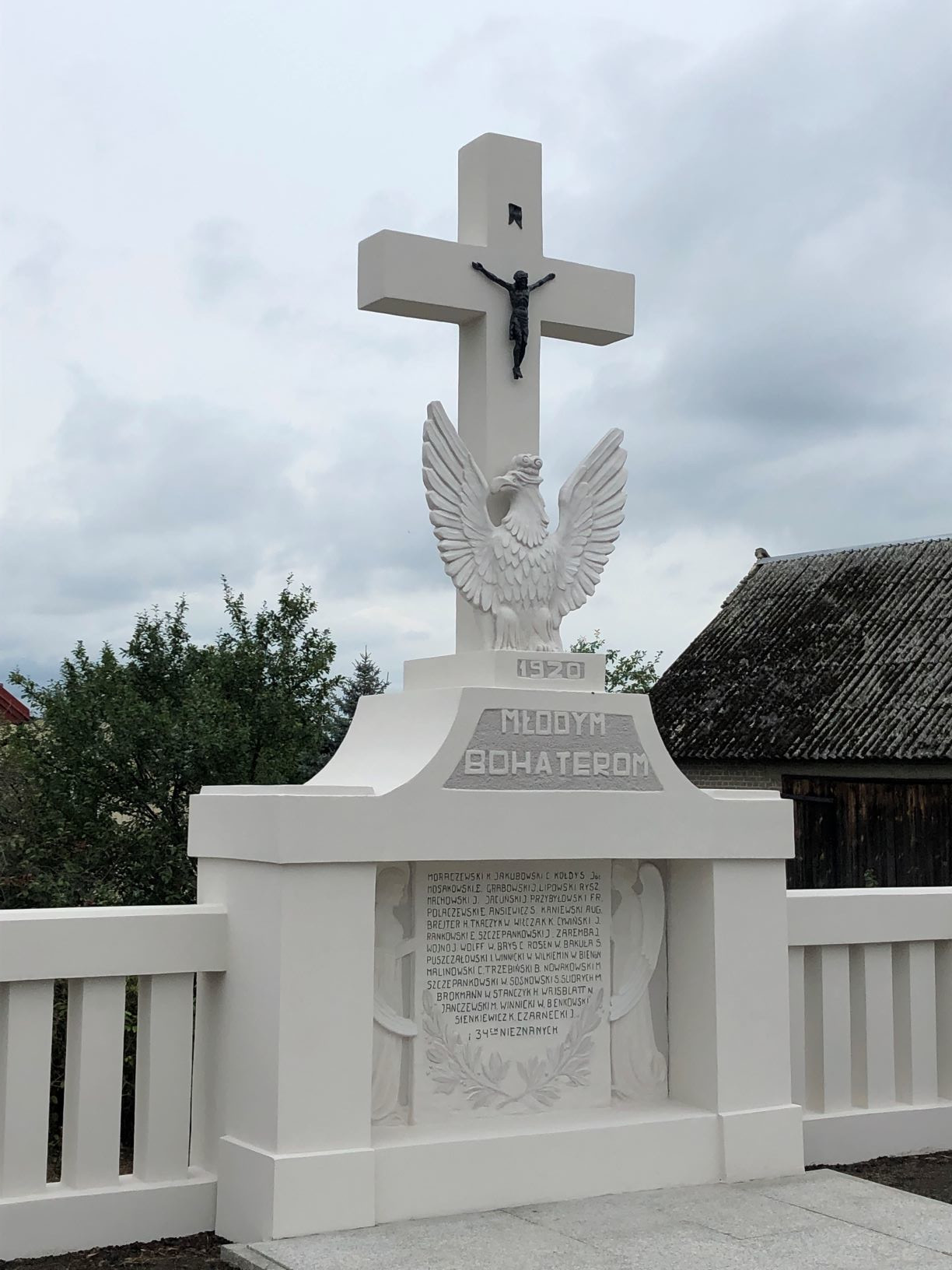 W mogile zbiorowej położonej na południowym skraju miasta spoczywa 42 znanych z nazwiska i 34 niezidentyfikowanych żołnierzy Wojska Polskiego z 205. Pułku Piechoty, poległych w walkach pod Nowogrodem 1 sierpnia 1920 r. W 1923 r. grób otoczony został drewnianym płotem i oznakowany wysokim, drewnianym krzyżem z kowalskim zwieńczeniem. W późniejszym okresie, jednak brak danych kiedy dokładnie, na mogile wzniesiono murowany nagrobek z inskrypcją upamiętniającą poległych, zwieńczony figurą orła i krzyżem . W niszy umieszczono listę poległych żołnierzy oraz informację o liczbie żołnierzy, których nie udało się zidentyfikować. Nad nazwiskami znajduje się napis: MŁODYM BOHATEROM. Grób otacza masywne betonowe ogrodzenie z bramką. Treść inskrypcji: MORACZEWSKI K. JAKUBOWSKI C. KOŁDYS Józ. MOSAKOWSKI C. GRABOWSKI J. LIPOWSKI RYSZ. MACHOWSKI J. JACUŃSKI J. PRZYBYŁOWSKI FR. POLACZEWSKI E. ANSIEWICZ S. KANIEWSKI AUG. BREITER H. TKACZYK W. WIŁCZAK K. CYWIŃSKI J. RANKOWSKI F. SZCZEPANKOWSKI J. ZAREMBA J. WOJNO J. WOLFF W. BRYŚ C. ROSEN W. BAKUŁA B. BUSZCZAŁOWSKI I. WINNICKI W. WILKIEMIN W. BIENÓW KALINOWSKI C. TRZEBIŃSKI B. NOWAKOWSKI M. SZCZEPANKOWSKI W. SOSNOWSKI S. SUDRYCKI M. BROKMANN W. STAŃCZYK H. WAISBLATT N. JANCZEWSKI M. WINNICKI W. BIEŃKOWSKI SIENKIEWICZ K. CZARNECKI J. 34 NIEZNANYCH Lista strat Wojska Polskiego zawiera nazwiska dziesięciu lub jedenastu żołnierzy poległych 1 sierpnia 1920 r. pod Nowogrodem. Trzech z nich: Stefan Antosiewicz, szeregowy 205 Pułku Piechoty, poległ 1 VIII 1920 r. Na tablicy wymieniony jako Ansiewicz S. Henryk Breiter, szeregowy 205 Pułku Piechoty, poległ 1 VIII 1920 r. Kazimierz Moraczewski, szeregowy 205. Pułku Piechoty, poległ 1 VIII 1920 r. zostało wymienionych na tablicy epitafijnej nagrobka. Być może, do tej listy można dodać również innych poległych tego samego dnia: Jan Antczak, ułan 115 Pułku Ułanów, poległ 1 VIII 1920 r. Robert Halper, szeregowy 205. Pułku Piechoty, poległ 1 VIII 1920 r. Otton Kamieński, szeregowy 205. Pułku Piechoty, poległ 1 VIII 1920 r. Stefan Raniewski, szeregowy 205. Pułku Piechoty, poległ 1 VIII 1920 r. albo Stefan Roniewski, szeregowy 205. Pułku Piechoty, poległ 1 VIII 1920 r. Tadeusz Tomaszewski, kapral 115. Pułku Ułanów, poległ 1 VIII 1920 r. Czesław Zawadzki, szeregowy 205. Pułku Piechoty, poległ 1 VIII 1920 r. Julian Zborowski, szeregowy 205. Pułku Piechoty, poległ 1 VIII 1920 r. Pod Nowogrodem zginął także sierżant Roman Dobroński, student Uniwersytetu Warszawskiego (ryc. 155). Nie wiadomo, gdzie został pochowany. Na liście strat odnajdujemy też nazwisko Michała Musiała, sapera 1. Pułku inż., który utonął 5 VI 1919 r. Miejsce jego pochówku jest nieznane. Być może spoczywa na cmentarzu parafialnym. Źródło: Małgorzata Karczewska, Maciej Karczewski, Miejsca pamięci czynu niepodległościowego na północno-wschodnim Mazowszu, Białystok 2019, tam wcześniejsza literatura. Fot. © Małgorzata Karczewska