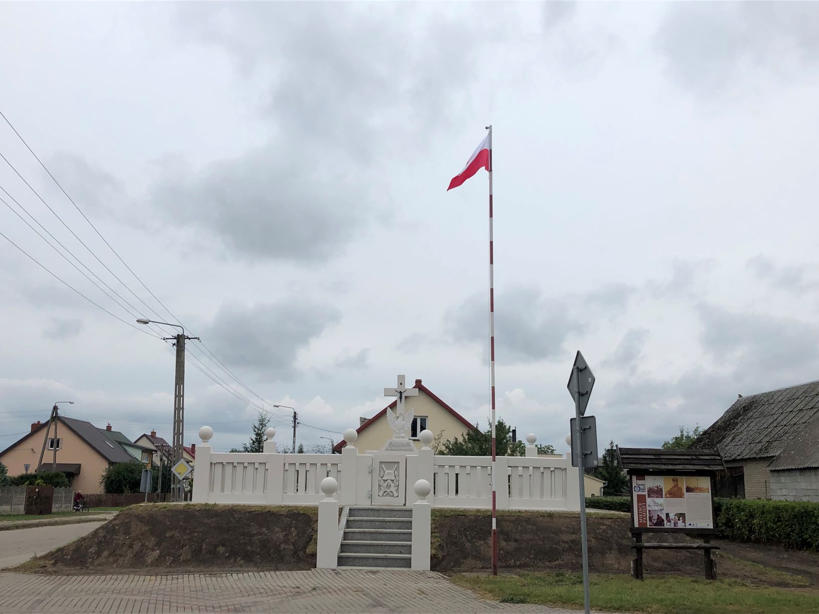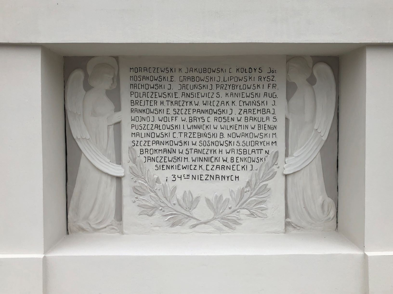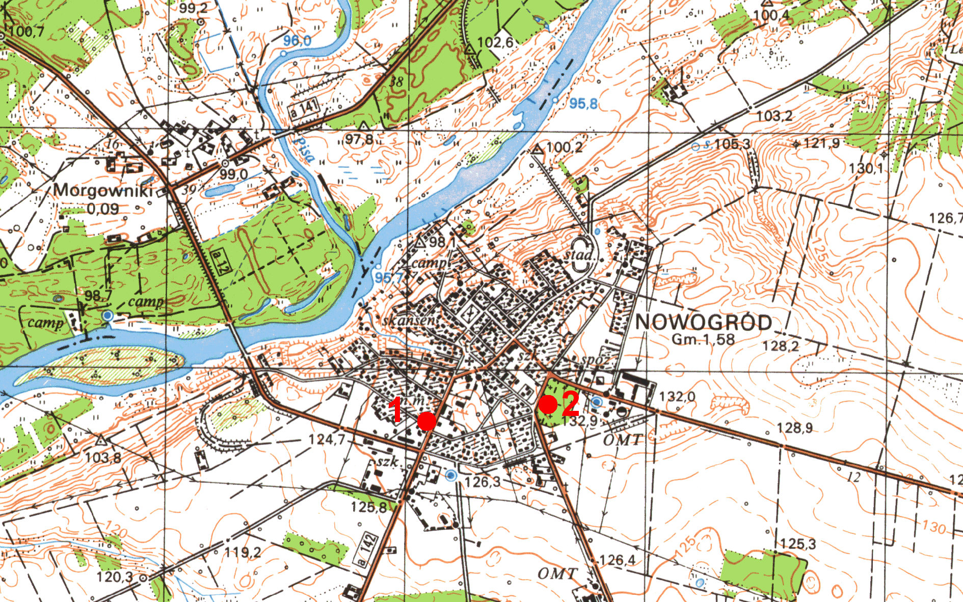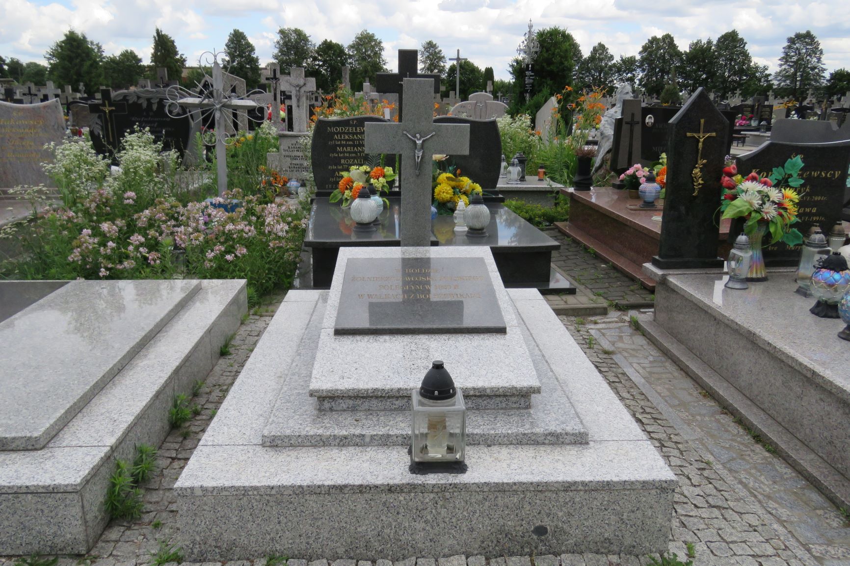 W mogile zbiorowej położonej na południowym skraju miasta spoczywa 42 znanych z nazwiska i 34 niezidentyfikowanych żołnierzy Wojska Polskiego z 205. Pułku Piechoty, poległych w walkach pod Nowogrodem 1 sierpnia 1920 r. W 1923 r. grób otoczony został drewnianym płotem i oznakowany wysokim, drewnianym krzyżem z kowalskim zwieńczeniem. W późniejszym okresie, jednak brak danych kiedy dokładnie, na mogile wzniesiono murowany nagrobek z inskrypcją upamiętniającą poległych, zwieńczony figurą orła i krzyżem . W niszy umieszczono listę poległych żołnierzy oraz informację o liczbie żołnierzy, których nie udało się zidentyfikować. Nad nazwiskami znajduje się napis: MŁODYM BOHATEROM. Grób otacza masywne betonowe ogrodzenie z bramką. Treść inskrypcji: MORACZEWSKI K. JAKUBOWSKI C. KOŁDYS Józ. MOSAKOWSKI C. GRABOWSKI J. LIPOWSKI RYSZ. MACHOWSKI J. JACUŃSKI J. PRZYBYŁOWSKI FR. POLACZEWSKI E. ANSIEWICZ S. KANIEWSKI AUG. BREITER H. TKACZYK W. WIŁCZAK K. CYWIŃSKI J. RANKOWSKI F. SZCZEPANKOWSKI J. ZAREMBA J. WOJNO J. WOLFF W. BRYŚ C. ROSEN W. BAKUŁA B. BUSZCZAŁOWSKI I. WINNICKI W. WILKIEMIN W. BIENÓW KALINOWSKI C. TRZEBIŃSKI B. NOWAKOWSKI M. SZCZEPANKOWSKI W. SOSNOWSKI S. SUDRYCKI M. BROKMANN W. STAŃCZYK H. WAISBLATT N. JANCZEWSKI M. WINNICKI W. BIEŃKOWSKI SIENKIEWICZ K. CZARNECKI J. 34 NIEZNANYCH Lista strat Wojska Polskiego zawiera nazwiska dziesięciu lub jedenastu żołnierzy poległych 1 sierpnia 1920 r. pod Nowogrodem. Trzech z nich: Stefan Antosiewicz, szeregowy 205 Pułku Piechoty, poległ 1 VIII 1920 r. Na tablicy wymieniony jako Ansiewicz S. Henryk Breiter, szeregowy 205 Pułku Piechoty, poległ 1 VIII 1920 r. Kazimierz Moraczewski, szeregowy 205. Pułku Piechoty, poległ 1 VIII 1920 r. zostało wymienionych na tablicy epitafijnej nagrobka. Być może, do tej listy można dodać również innych poległych tego samego dnia: Jan Antczak, ułan 115 Pułku Ułanów, poległ 1 VIII 1920 r. Robert Halper, szeregowy 205. Pułku Piechoty, poległ 1 VIII 1920 r. Otton Kamieński, szeregowy 205. Pułku Piechoty, poległ 1 VIII 1920 r. Stefan Raniewski, szeregowy 205. Pułku Piechoty, poległ 1 VIII 1920 r. albo Stefan Roniewski, szeregowy 205. Pułku Piechoty, poległ 1 VIII 1920 r. Tadeusz Tomaszewski, kapral 115. Pułku Ułanów, poległ 1 VIII 1920 r. Czesław Zawadzki, szeregowy 205. Pułku Piechoty, poległ 1 VIII 1920 r. Julian Zborowski, szeregowy 205. Pułku Piechoty, poległ 1 VIII 1920 r. Pod Nowogrodem zginął także sierżant Roman Dobroński, student Uniwersytetu Warszawskiego (ryc. 155). Nie wiadomo, gdzie został pochowany. Na liście strat odnajdujemy też nazwisko Michała Musiała, sapera 1. Pułku inż., który utonął 5 VI 1919 r. Miejsce jego pochówku jest nieznane. Być może spoczywa na cmentarzu parafialnym. Źródło: Małgorzata Karczewska, Maciej Karczewski, Miejsca pamięci czynu niepodległościowego na północno-wschodnim Mazowszu, Białystok 2019, tam wcześniejsza literatura. Fot. © Małgorzata Karczewska