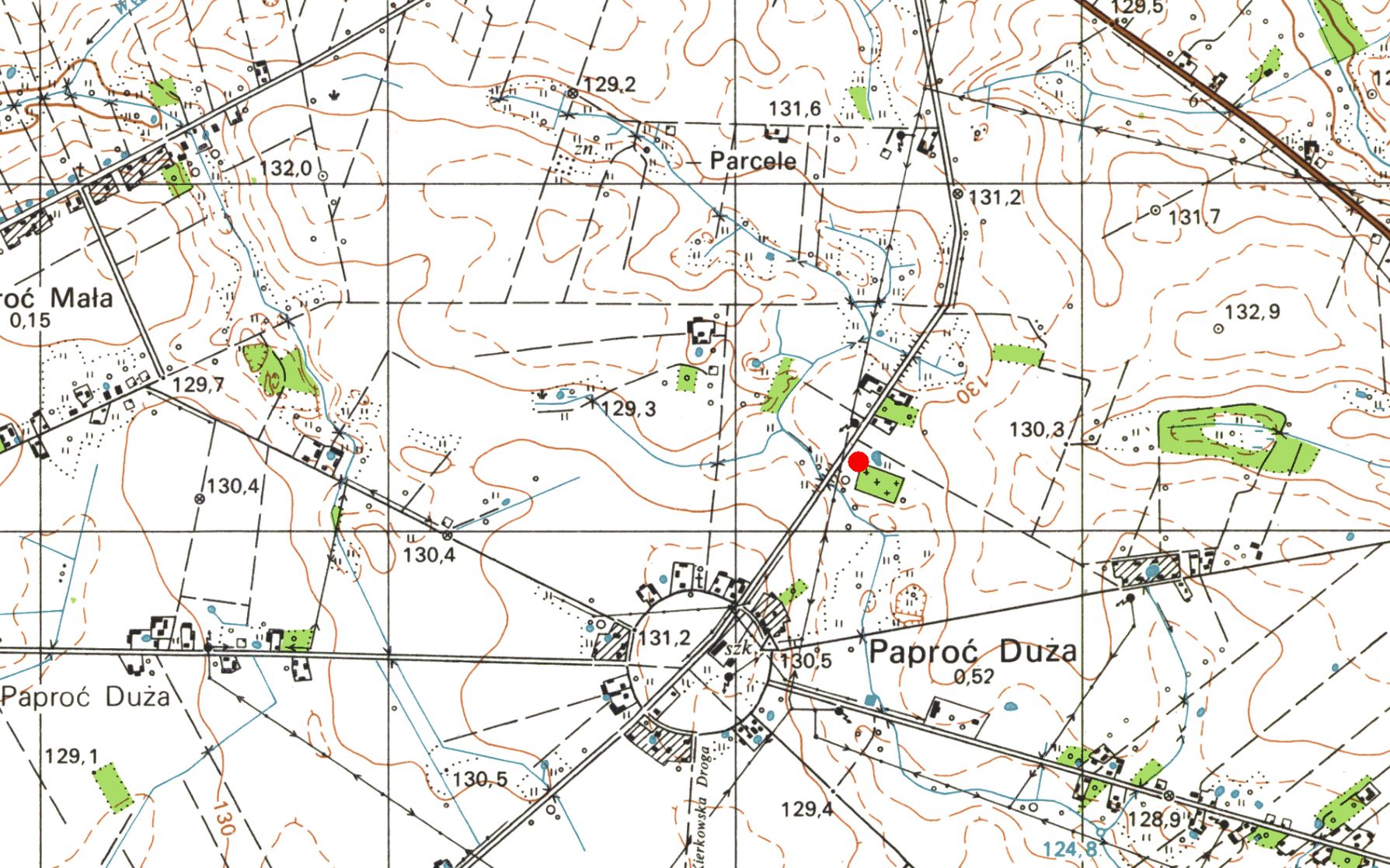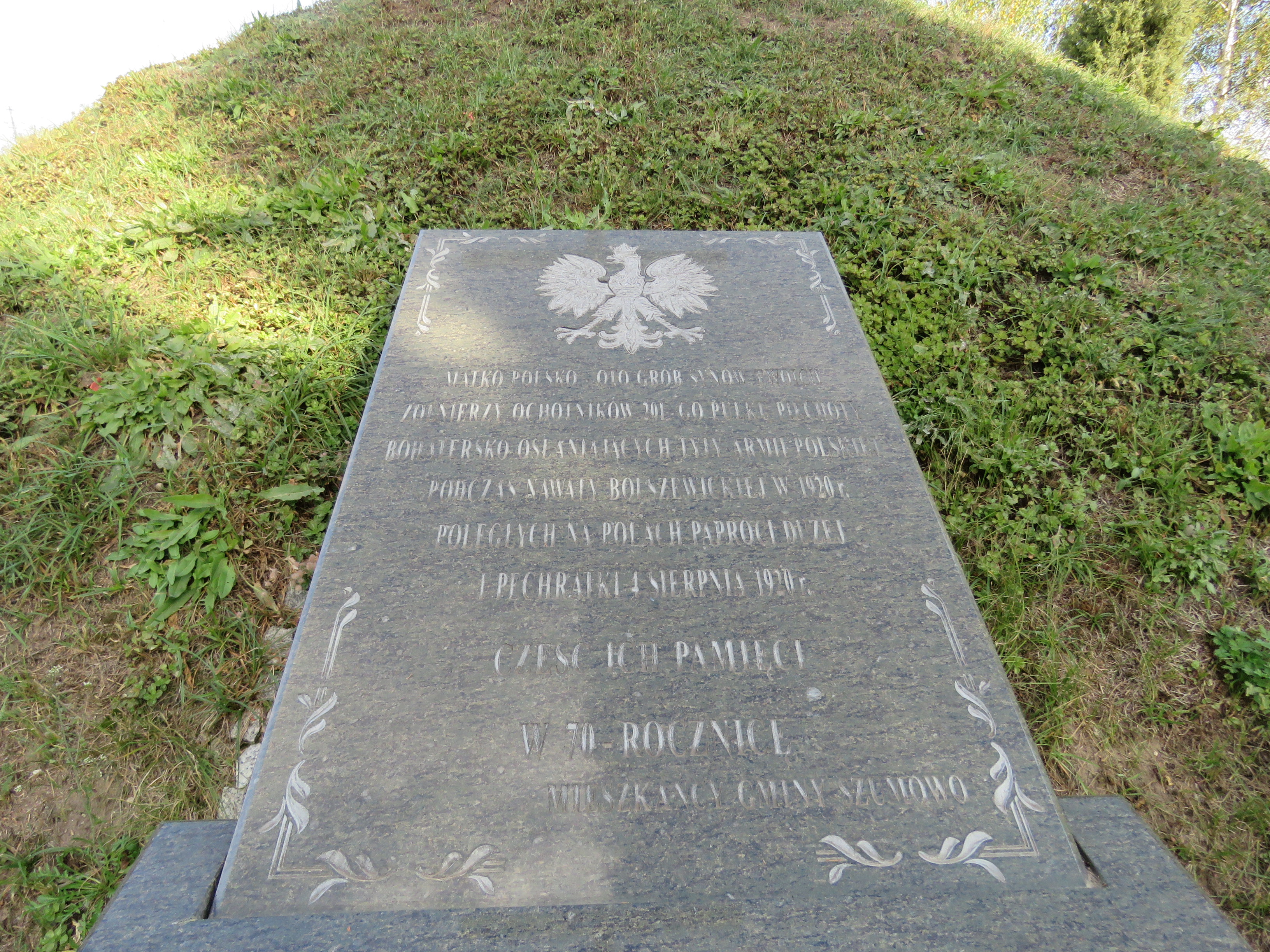 Na północny-wschód od wsi, na skraju cmentarza ewangelickiego, podczas I wojny światowej, w zbiorowej mogile przykrytej wysokim kurhanem pochowanych zostało 92 żołnierzy armii rosyjskiej. Najprawdopodobniej byli wśród nich Polacy. Kilka lat później, w 1920 r. pochowano w niej także nieokreśloną liczbę żołnierzy polskich poległych na początku sierpnia 1920 r. w okolicach Paproci Dużej i Pęchratki Polskiej. Pamięć o znajdującym się w tym miejscu pochówku z czasów I wojny światowej została zatarta. Większość z poległych pod Paprocią Dużą i Pęchratką Polską znalazła miejsce ostatniego spoczynku na cmentarzu parafialnym w Szumowie. W wykazie Lista strat Wojska Polskiego "Polegli i zmarli w wojnach 1918-1920" Wojskowego Biura Historycznego znajdują się nazwiska dwóch żołnierzy poległych w walkach pod Paprocią. Tadeusz Wierzbowski z 201. Pułku Piechoty, poległy 25 VIII 1920 r. został pochowany na cmentarzu parafialnym w Szumowie. Drugim żołnierzem był Kazimierz Wyszyński, podporucznik 202. Pułku Piechoty, poległy 4 VIII 1920 r. Miejsce jego ostatniego spoczynku jest nieznane, można jednak przypuszczać, że jest on jednym z pochowanym w mogile zbiorowej w Paproci Dużej. Jednak w treści pamiątkowej inskrypcji wzmiankowani są jedynie polegli z 201. Pułku Piechoty. Tablica wkomponowana w kurhan została ufundowana w 1990 r. Jej treść brzmi: MATKO POLSKO, OTO GRÓB SYNÓW TWOICH / ŻOŁNIERZY OCHOTNIKÓW 201-GO PUŁKU PIECHOTY / BOHATERSKO OSŁANIAJĄCYCH TYŁY ARMII POLSKIEJ / PODCZAS NAWAŁY BOLSZEWICKIEJ W 1920 r. / POLEGŁYCH NA POLACH PAPROCI DUŻEJ / I PĘCHRATKI 4 SIERPNIA 1920 r. / CZĘŚĆ ICH PAMIĘCI / W 70-ROCZNICĘ / MIESZKAŃCY GMINY SZUMOWO. Źródło: Małgorzata Karczewska, Maciej Karczewski, Miejsca pamięci czynu niepodległościowego na północno-wschodnim Mazowszu, Białystok 2019. Fot. © Małgorzata Karczewska i portal mapowy Narodowego Instytutu Dziedzictwa.