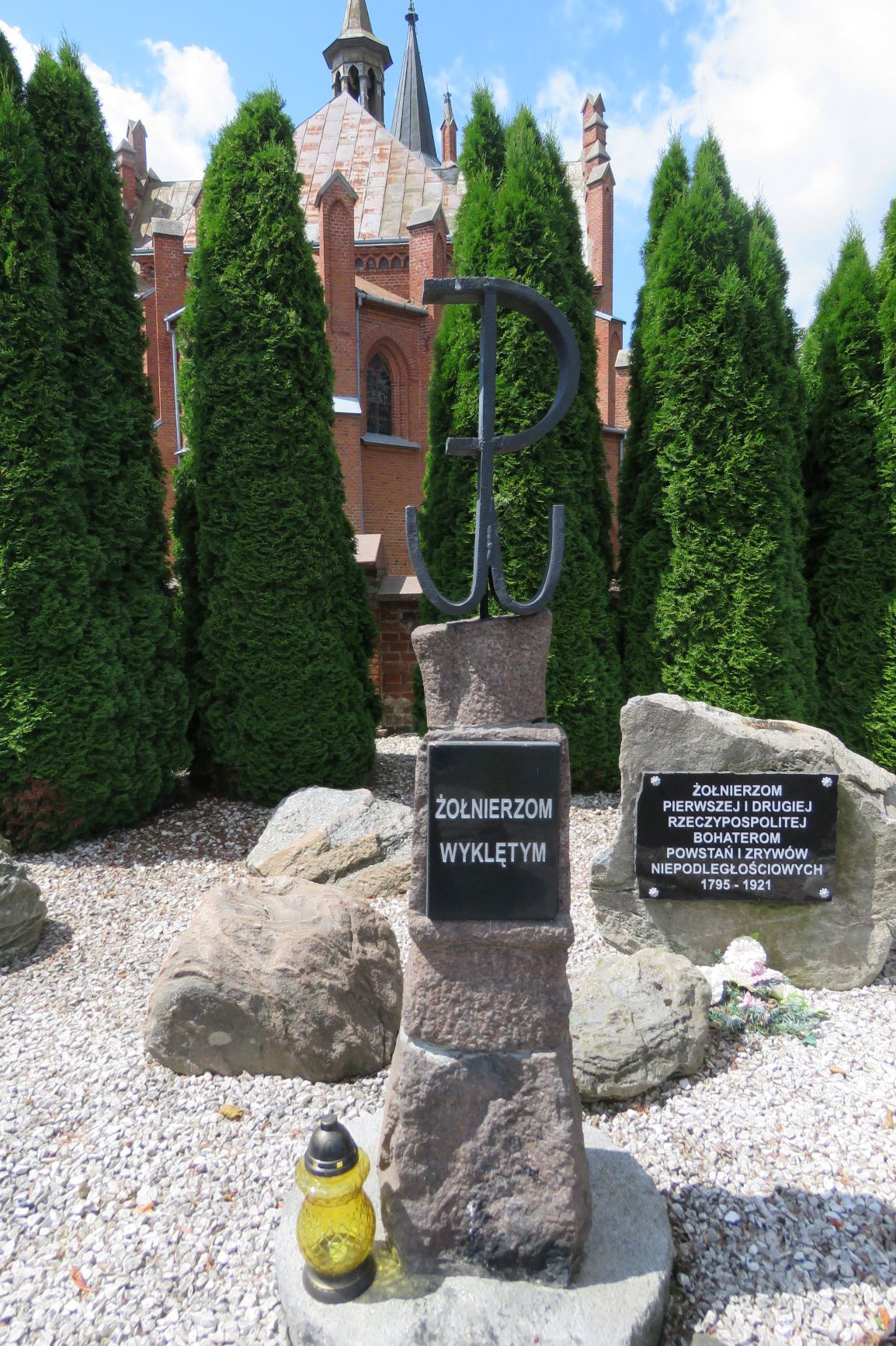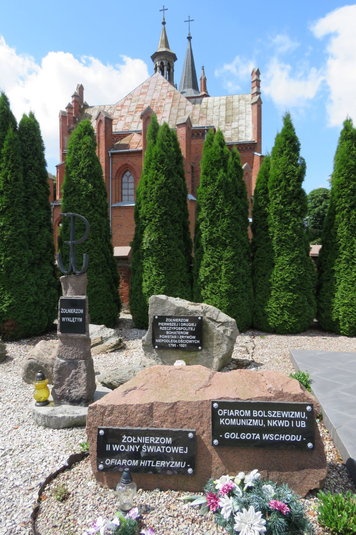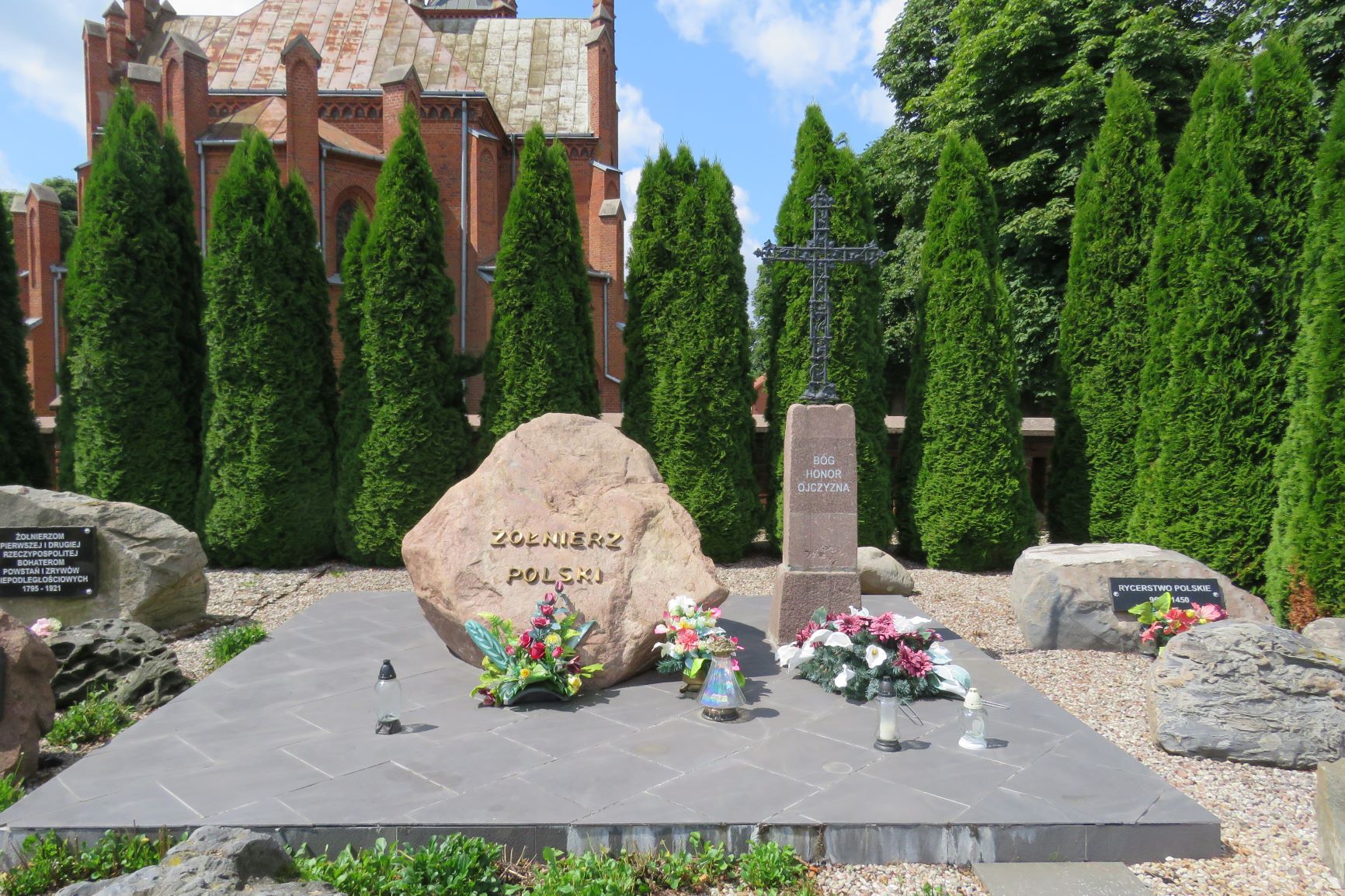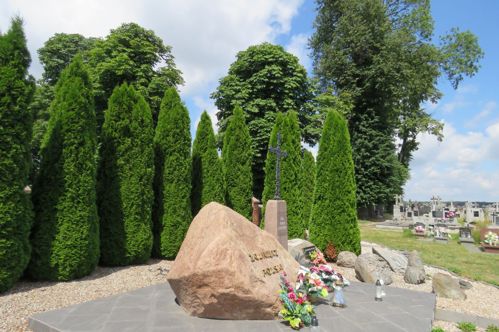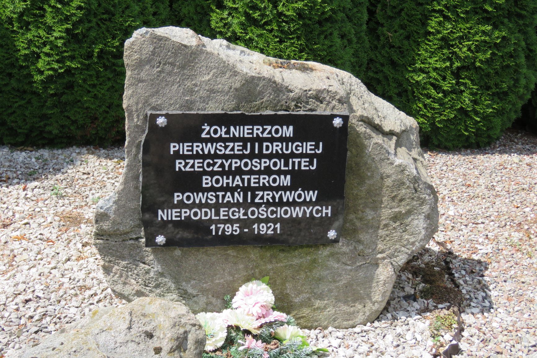 Kilka lat temu, w południowej części cmentarza parafialnego powstało miejsce pamięci o szerokim przekazie symbolicznym związanym w wojskiem polskim od czasów Polski piastowskiej do współczesności. Na terenie wydzielonym szpalerowym nasadzeniem tuj rozmieszczono dwa nagrobki przeniesione znad mogił oraz kilkanaście głazów granitowych. Kilka z nich upamiętnia momenty przełomowe w dziejach polskiej wojskowości, w tym walki narodowo-wyzwoleńcze w czasie zaborów oraz wojnę polsko-bolszewicką. Inskrypcja: ŻOŁNIERZOM / PIERWSZEJ I DRUGIEJ / RZECZYPOSPOLITEJ / BOHATEROM / POWSTAŃ I ZRYWÓW / NIEPODLEGŁOŚCIOWYCH / 1795-1921. Źródło: Małgorzata Karczewska, Maciej Karczewski, Miejsca pamięci czynu niepodległościowego na północno-wschodnim Mazowszu, Białystok 2019. Fot. © Małgorzata Karczewska