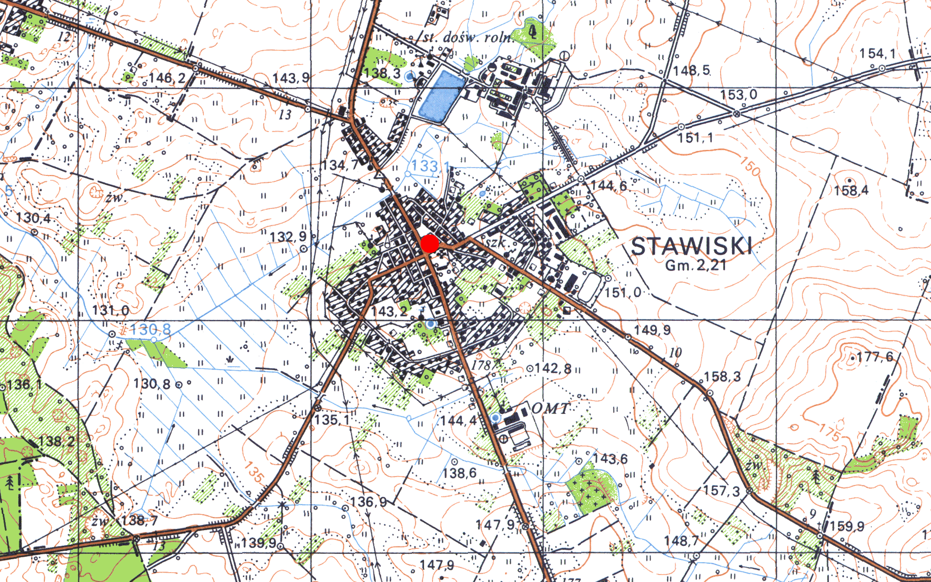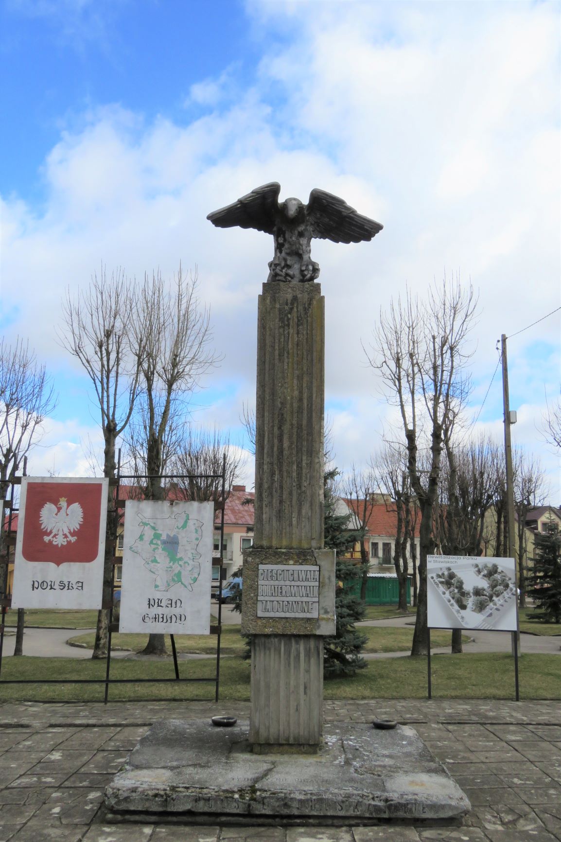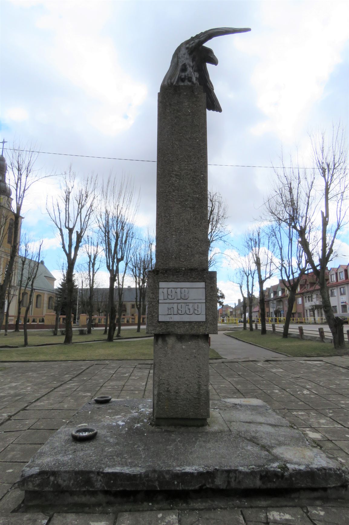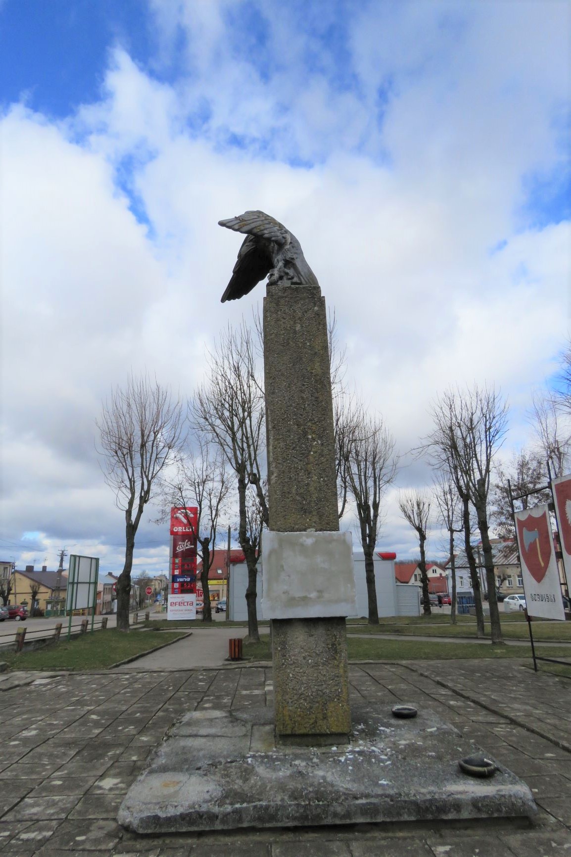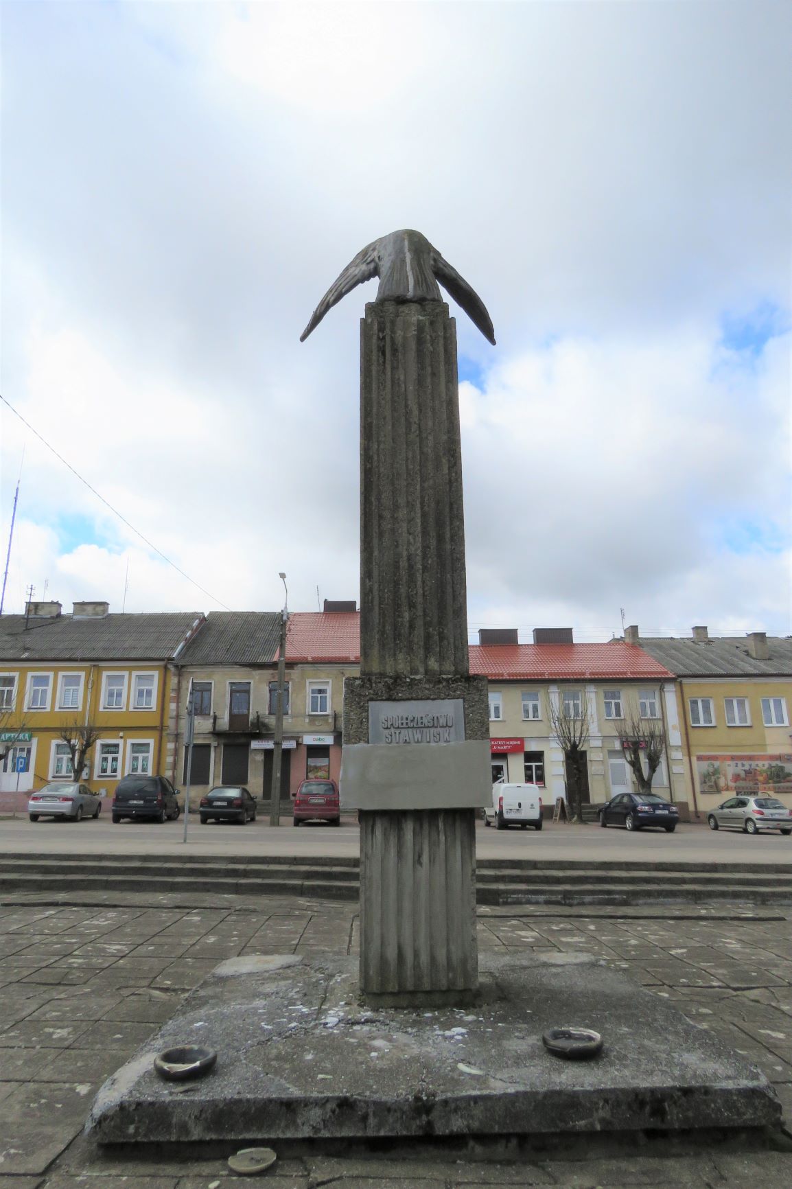 W 1924 r. na głównym placu Stawisk został odsłonięty pomnik Orła Białego. Upamiętniał walki o odzyskanie niepodległości oraz wojnę polsko-bolszewicką 1920 r. Jego wygląd różnił się od współczesnego, jednak niedostatki zachowanej ikonografii utrudniają precyzyjny opis tych różnic . Wiadomo, że pomnik przetrwał II wojnę światową. Na fotografii z 1952 r. widoczny jest czterokondygnacyjny monument, zwężający się ku górze, tynkowany na biało, zwieńczony metalowym orłem. Przez kilka powojennych dekad pozostawał jednak w zapomnieniu. Nowy pomnik wzniesiono w 1969 r. według projektu Ferdynanda Jarocha. Na czworobocznej, smukłej kolumnie zdobionej kanelurami umieszczono rzeźbę orła z rozpostartymi skrzydłami. Na rozszerzeniach cokołu znajdują się cztery tablice pamiątkowe z inskrypcjami. Obecnie czytelne są trzy z nich, jedna tylko częściowo: CZEŚĆ I CHWAŁA / BOHATEROM WALK / ZA OJCZYZNĘ / 1918 / i 1939 / SPOŁECZEŃSTWO / STAWISK [tekst usunięty] Do 2019 r. pomnik był zachowany w złym stanie i wymagał pilnego remontu. Działania takie zostały podjęte w ramach prac rewitalizacyjnych rynku. Źródło: Małgorzata Karczewska, Maciej Karczewski, Miejsca pamięci czynu niepodległościowego na północno-wschodnim Mazowszu, Białystok 2019, tam wcześniejsza literatura. Fot. © Małgorzata Karczewska