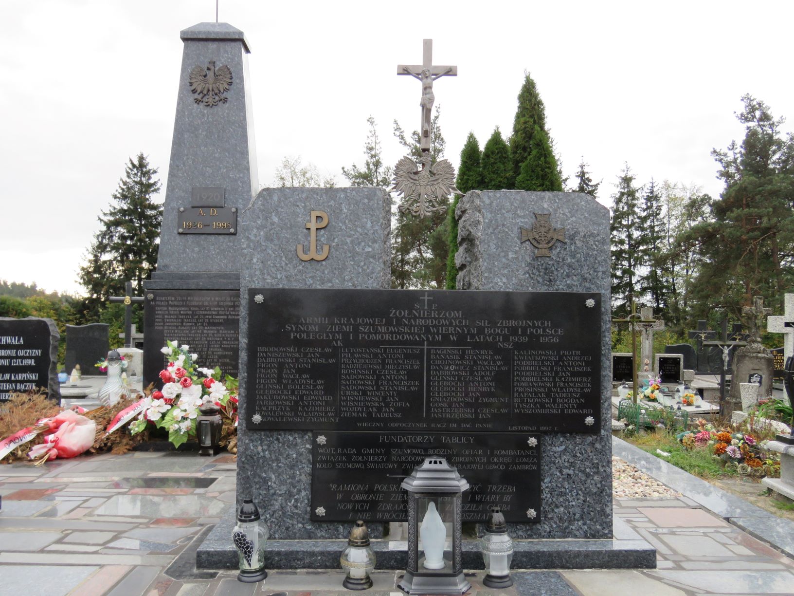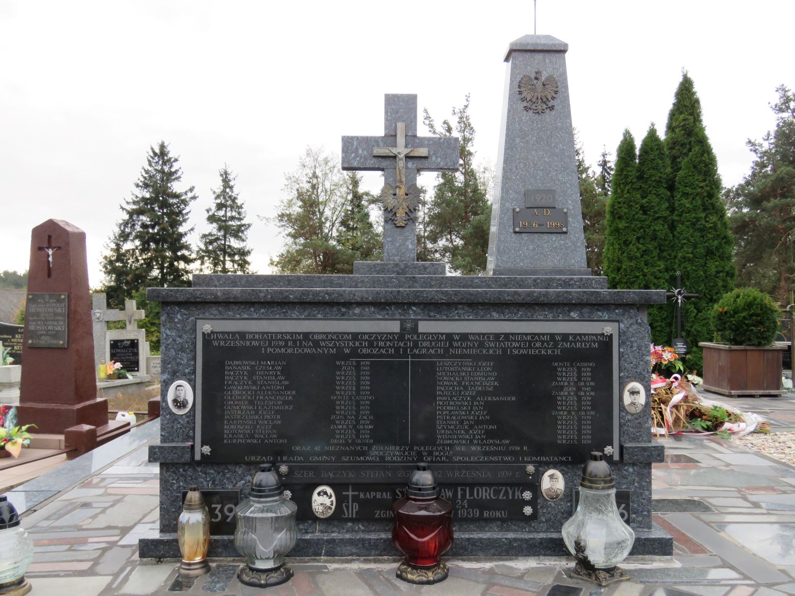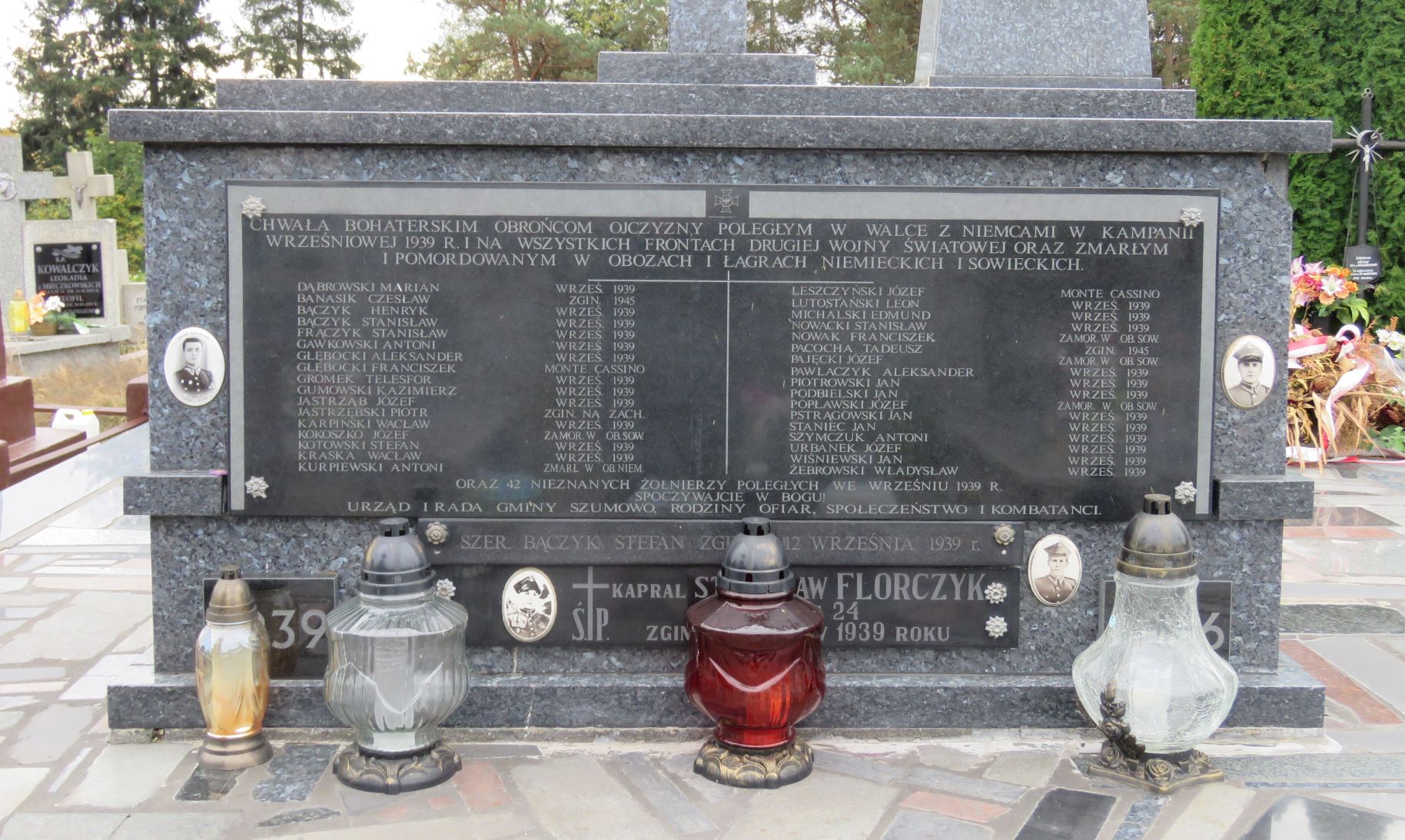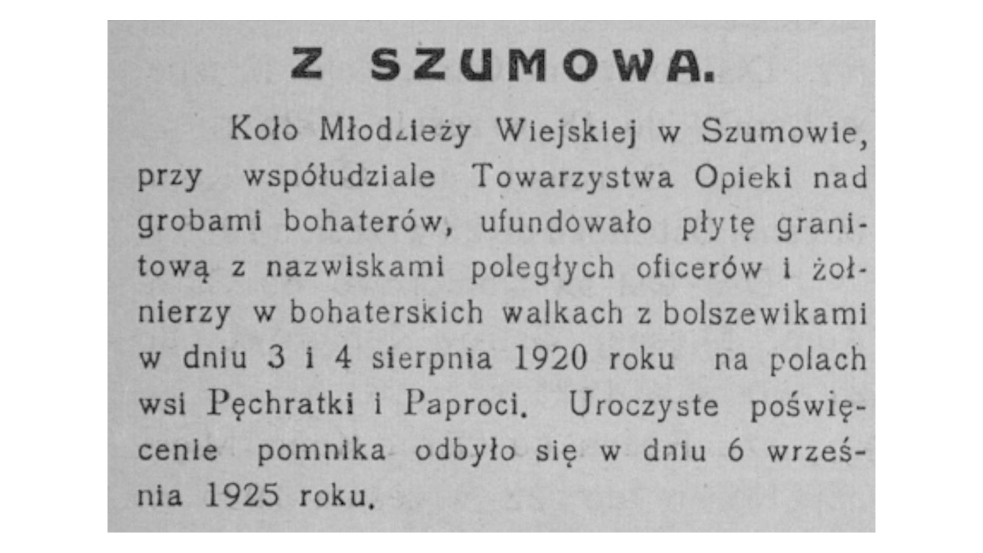 Na cmentarzu parafialnym w Szumowie znajdują się dwie mogiły żołnierzy II batalionu 201. Ochotniczego Pułku Piechoty poległych 4 sierpnia 1920 r. pod Paprocią Dużą i Pęchratką Polską. Zginęło wówczas ponad sześćdziesięciu żołnierzy-ochotników, w większości uczniów. Część z nich pochowano w mogile zbiorowej w Paproci Dużej, pozostałych we wspólnej mogile na szumowskim cmentarzu. W 1925 r. staraniem Koła Młodzieży Wiejskiej z Pęchratki Polskiej i rodzin poległych ufundowano obelisk zwieńczony krzyżem. Poświęcenie nagrobka odbyło się w niedzielę, 6 września. W uroczystości wzięli udział członkowie rodzin poległych żołnierzy, przedstawiciele dowództwa 71. Pułku Piechoty z Ostrowi Mazowieckiej, orkiestra i kompania żołnierzy tego pułku, harcerze z gimnazjum w Ostrowi Mazowieckiej, delegacja biskupstwa, poseł na sejm R. Bielicki, młodzież z Kół Młodzieży Wiejskiej w Pęchratce i Srebrnej oraz mieszkańcy wsi . W latach powojennych nagrobek był kilka razy niszczony przez nieznanych sprawców, działających zapewne pod wpływem ideologii ówczesnych czasów. Pamiątkowa inskrypcja na nagrobku brzmi: BOHATEROM 201-GO P.P. POLEGŁYM W WALCE ZA OJCZYZNĘ NA POLACH PAPROCI I PĘCHRATKI DN. 4-GO SIERPNIA 1920 ROKU KAPITAN WĄDOŁKOWSKI KAROL, LAT 27, DOWÓDCA II BAT. 201 P.P. KAWALER VIRTUTI MILITARI I CZTEROKROTNIE KRZYŻA WALECZNYCH. PPOR. WAGNER TADEUSZ, LAT 26, PPOR. CZAMOWSKI ALEKSANDER LAT 27. PPOR. SWISTALSKI TADEUSZ, LAT 21, STUDENT. PCHOR. JANKOWSKI HENRYK, LAT 26. PCHOR. MITKUS ALOJZY, LAT 22, MATURZYSTA. BEYER WILLIAM, LAT 40. WĄSOWSKI WŁADYSŁAW, L. 27 NAUCZY. WIERZBOWSKI TADEUSZ, LAT 26, SĘDZIA ŚLEDCZY. GORNICKI ALEKSY, LAT 34, URZĘDNIK P.K.P. NIEWIAROWSKI STANISŁAW, LAT 41, PROKURENT BANKU. KRUPIŃSKI APOLINARY, LAT 30, LITERAT, NAUCZYCIEL. WACHE STANISŁAW, LAT 28, STUDENT. ROSTKOWSKI MARJAN, LAT 25, HANDLOWIEC. BIELICKI SEWERYN, LAT 17, UCZEŃ. ROKOSSOWSKI WINCENTY, LAT 16, UCZEŃ. OMIECKI TADEUSZ, LAT 18, UCZEŃ. OWCZAREK ZYGMUNT, LAT 19, MATURZYSTA. KAMIŃSKI JULJAN, LAT 20, URZĘDNIK BANKU. LEMBICZ ALEKSANDER, LAT 16, UCZEŃ. WESOŁOWSKI TADEUSZ, LAT 18, UCZEŃ. GRYCZKIEWICZ EDWARD, LAT 24, RZEMIEŚLNIK. CIBOROWSKI ANTONI, LAT 28, HANDLOWIEC. LASTOWIECKI STEFAN, LAT 17, SZCZOTKARZ. BĄK MARJAN, LAT 18, UCZEŃ. GUJSKI ANTONI, LAT 24, NAUCZYCIEL. MIŁONCZ WITOLD, LAT 25, AGRONOM RYBAK. I WIELU INNYCH. Na liście strat Wojska Polskiego widnieje nazwisko Romana Wróbla, podporucznika 205. Pułku Piechoty, poległego 20 VIII 1920 r. w Szumowie lub okolicy . Być może on także spoczywa w mogile zbiorowej na szumowskim cmentarzu jako nieznanych żołnierz 1920 r. W 1939 r. mogiła zbiorowa została powiększona i pochowano w niej żołnierzy 18. Dywizji Piechoty poległych 12 września 1939 r. pod Łętownicą. Na pamiątkowej tablicy dodano także nazwiska poległych na innych frontach II wojny światowej oraz zmarłych i zamordowanych w obozach i łagrach. Upamiętniająca ich inskrypcja brzmi: CHWAŁA BOHATERSKIM OBROŃCOM OJCZYZNY POLEGŁYM W WALCE Z NIEMCAMI W KAMPANII / WRZEŚNIOWEJ 1939 R. I NA WSZYSTKICH FRONTACH DRUGIEJ WOJNY ŚWIATOWEJ ORAZ ZMARŁYM / I POMORDOWANYM W OBOZACH I ŁAGRACH NIEMIECKICH I SOWIECKICH. DĄBROWSKI MARIAN WRZEŚ. 1939 / BANASIK CZESŁAW ZGIN. 1945 / BĄCZYK HENRYK WRZEŚ. 1939 / BĄCZYK STANISŁAW WRZEŚ. 1939 / GAWKOWSKI ANTONI WRZEŚ. 1939 / GŁĘBOCKI ALEKSANDER WRZEŚ. 1939 / GŁĘBOCKI FRANCISZEK MONTE CASSINO / GROMEK TELESFOR WRZEŚ. 1939 / GUMOWSKI KAZIMIERZ WRZEŚ. 1939 / JASTRZĄB JÓZEF WRZEŚ. 1939 / JASTRZĘBSKI PIOTR ZGIN. NA ZACH. / KARPIŃSKI WACŁAW WRZEŚ. 1939 / KOKOSZKO JÓZEF ZAMOR. W OB. SOW. / KOTOWSKI STEFAN WRZEŚ. 1939 / KRASKA WACŁAW WRZEŚ. 1939 / KURPIEWSKI ANTONI ZMARŁ W OB. NIEM. LESZCZYŃSKI JÓZEF MONTE CASSINO / LUTOSTAŃSKI LEON WRZEŚ. 1939 / MICHALSKI EDMUND WRZEŚ. 1939 / NOWACKI STANISŁAW WRZEŚ. 1939 / NOWAK FRANCISZEK ZAMOR. W OB. SOW. / PACOCHA TADEUSZ ZGIN. 1945 / PAJĘCKI JÓZEF ZAMOR. W OB. SOW. / PAWLACZYK ALEKSANDER WRZEŚ. 1939 / PIOTROWSKI JAN WRZEŚ. 1939 / PODBIELSKI JAN WRZEŚ. 1939 / POPŁAWSKI JÓZEF ZAMOR. W OB. SOW. / PSTRĄGOWSKI JAN WRZEŚ. 1939 / STANIEC JAN WRZEŚ. 1939 / SZYMCZUK ANTONI WRZEŚ. 1939 / URBANEK JÓZEF WRZEŚ. 1939 / WIŚNIEWSKI JAN WRZEŚ. 1939 / ŻEBROWSKI WŁADYSŁAW WRZEŚ. 1939 / ORAZ 42 NIEZNANYCH ŻOŁNIERZY POLEGŁYCH WE WRZEŚNIU 1939 R. / SPOCZYWAJCIE W BOGU! / URZĄD I RADA GMINY SZUMOWO, RODZINY OFIAR, SPOŁECZEŃSTWO I KOMBATANCI. Poniżej dwie dodatkowe tablice z nazwiskami poległych, ustalonymi po ufundowaniu tablicy głównej: SZEREGOWY BĄCZYK STEFAN ZGINĄŁ 12 WRZEŚNIA 1939 R. KAPRAL STANISŁAW FLORCZYK / ŻYŁ LAT 24 / ZGINĄŁ W BOJU W 1939 R. W 1996 r. ufundowana została kolejna tablica upamiętniająca żołnierzy kampanii wrześniowej 1939 r., ale tylko tych, spoczywających na szumowskim cmentarzu: CZEŚĆ I CHWAŁA / BOHATEROM POLEGŁYM W OBRONIE OJCZYZNY / Z NAJEŹDŹCĄ HITLEROWSKIM W DNIU 12.IX.1939 R. / PODCH. EDWARD MICHALSKI KPR WACŁAW KARPIŃSKI / KPR. WŁADYSŁAW ŻEBROWSKI SZER. STEFAN BĄCZYK / ORAZ 42 NIEZNANYCH ŻOŁNIERZY / SPOŁECZEŃSTWO SZUMOWA I OKOLIC / W ROCZNICĘ 1000-LECIA PAŃSTWA POLSKIEGO Dekadę później, symbolika miejsca pamięci została rozszerzona o pamięć pochodzących z Szumowa i okolic żołnierzy Armii Krajowej i Narodowych Sił Zbrojnych: ŻOŁNIERZOM / ARMII KRAJOWEJ I NARODOWYCH SIŁ ZBROJNYCH / SYNOM ZIEMI SZUMOWSKIEJ WIERNYM BOGU I POLSCE / POLEGŁYM I POMORDOWANYM W LATACH 1939-1956 / AK / BRODOWSKI CZESŁAW / LUTOSTAŃSKI EUGENIUSZ / DANISZEWSKI JAN / PILAWSKI ANTONI / DOBROWOLSKI STANISŁAW / PRZYCHODZEŃ FRANCISZEK / FIGOŃ ANTONI / RADZIEJEWSKI MIECZYSŁAW / FIGOŃ JAN / ROSIŃSKI CZESŁAW / FIGOŃ WACŁAW / SADOWSKI ANTONI / FIGOŃ WŁADYSŁAW / SADOWSKI FRANCISZEK / GLIŃSKI BOLESŁAW / SADOWSKI STANISŁAW / GŁĘBOCKI EDWARD / URSKI WINCENTY / JAKUBOWSKI EDWARD / WIŚNIEWSKI JAN / JARKOWSKI ANTONI / WIŚNIEWSKA ZOFIA / KACPRZYK