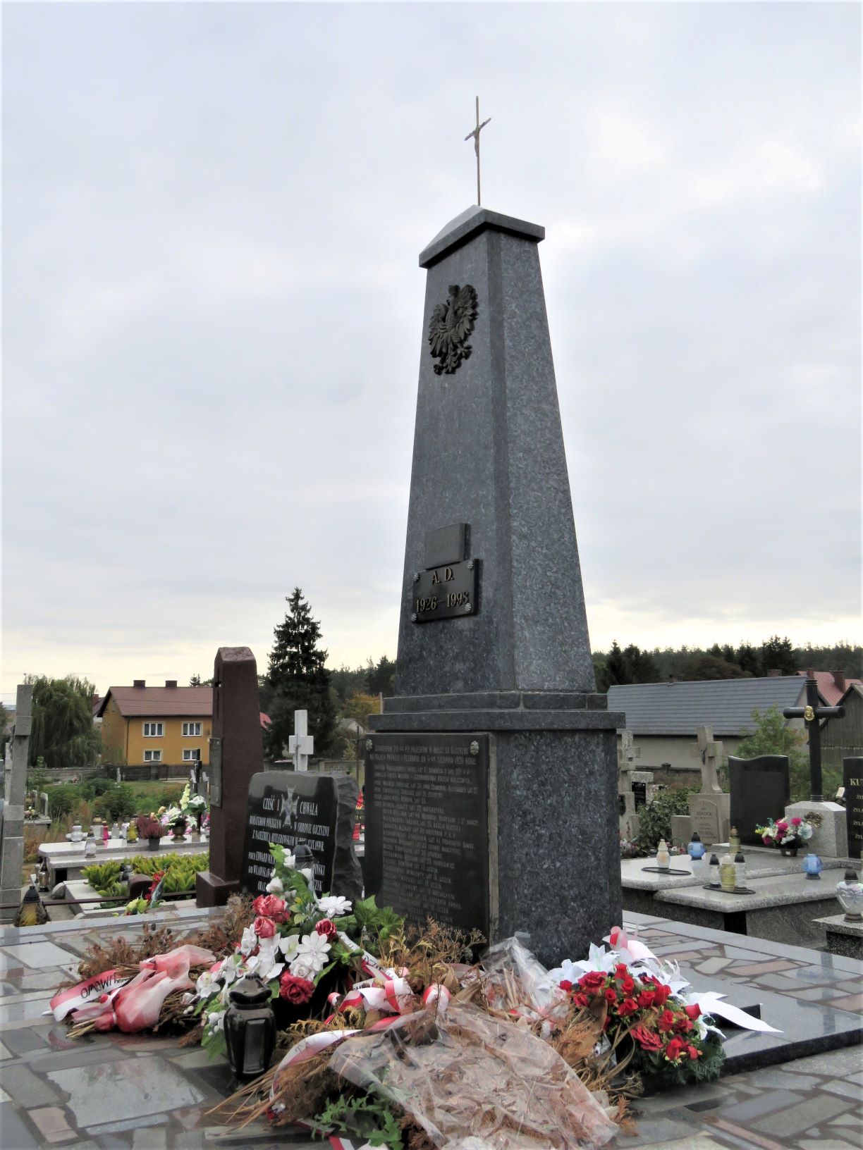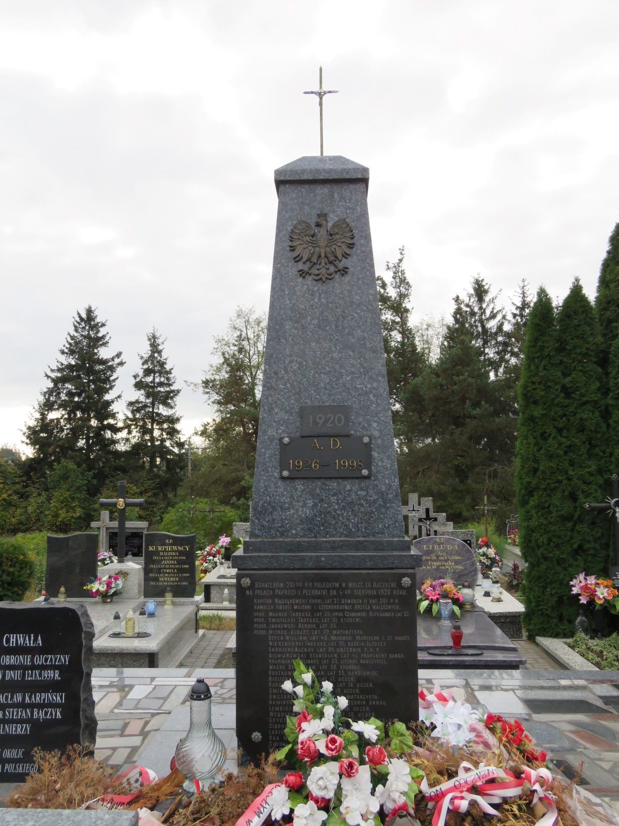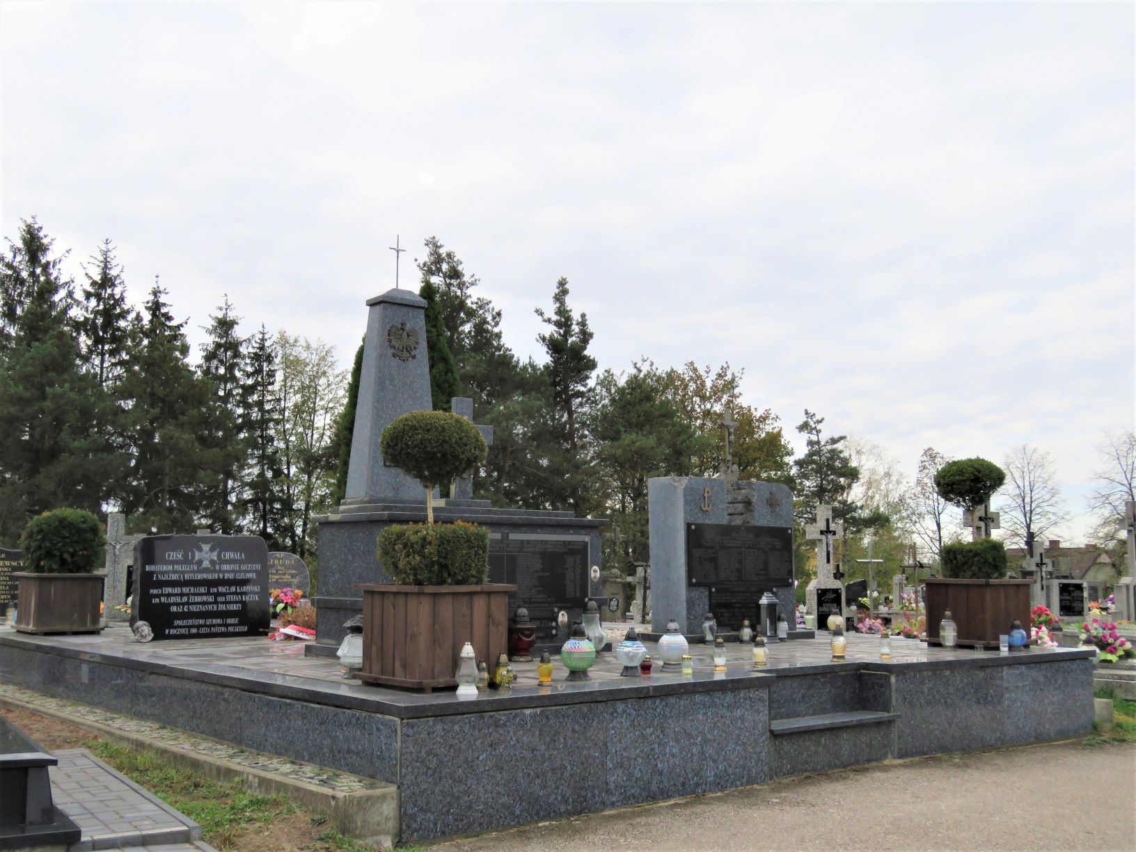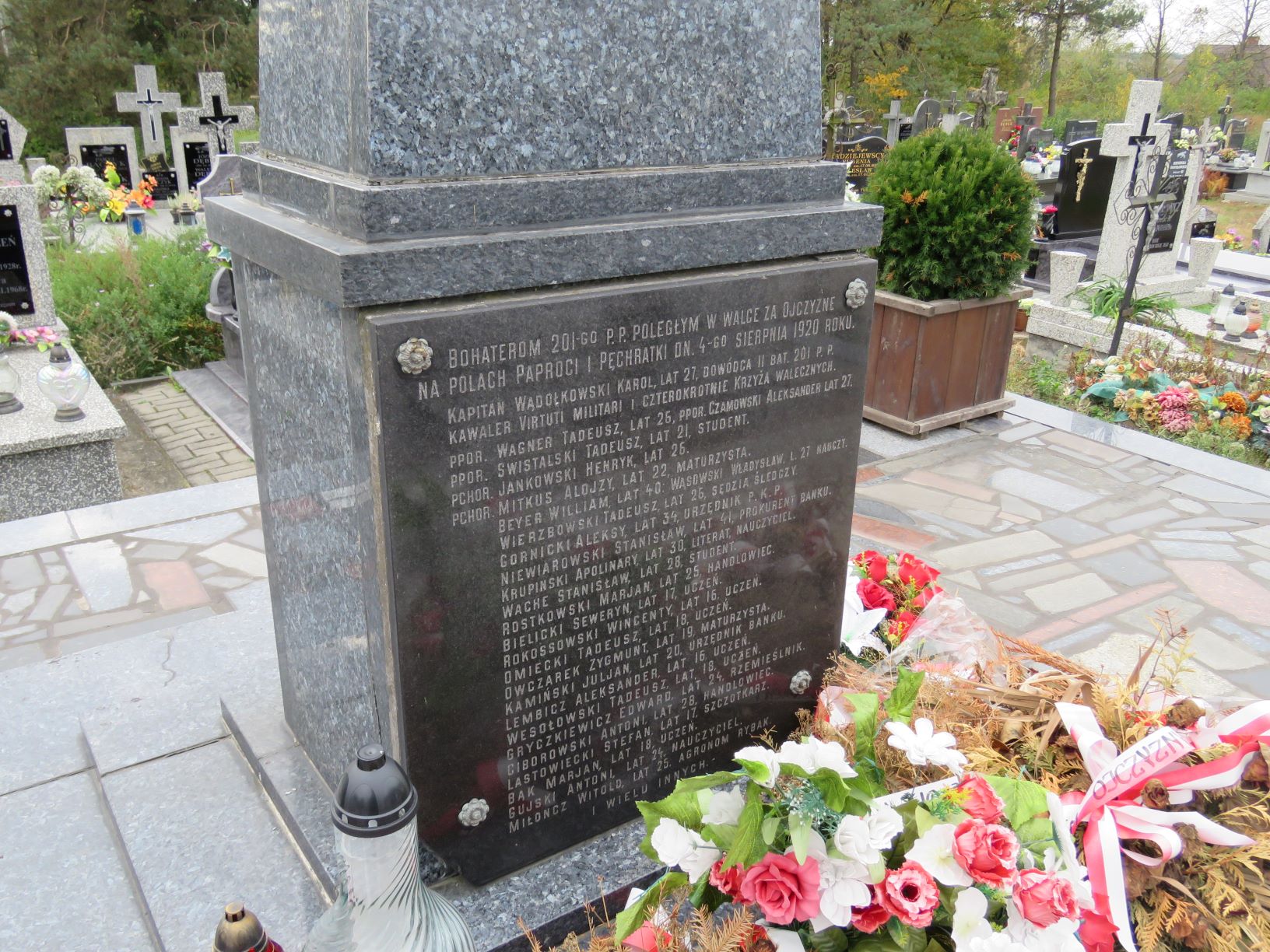 Na cmentarzu parafialnym w Szumowie znajdują się dwie mogiły żołnierzy II batalionu 201. Ochotniczego Pułku Piechoty poległych 4 sierpnia 1920 r. pod Paprocią Dużą i Pęchratką Polską. Zginęło wówczas ponad sześćdziesięciu żołnierzy-ochotników, w większości uczniów. Część z nich pochowano w mogile zbiorowej w Paproci Dużej, pozostałych we wspólnej mogile na szumowskim cmentarzu. W 1925 r. staraniem Koła Młodzieży Wiejskiej z Pęchratki Polskiej i rodzin poległych ufundowano obelisk zwieńczony krzyżem. Poświęcenie nagrobka odbyło się w niedzielę, 6 września. W uroczystości wzięli udział członkowie rodzin poległych żołnierzy, przedstawiciele dowództwa 71. Pułku Piechoty z Ostrowi Mazowieckiej, orkiestra i kompania żołnierzy tego pułku, harcerze z gimnazjum w Ostrowi Mazowieckiej, delegacja biskupstwa, poseł na sejm R. Bielicki, młodzież z Kół Młodzieży Wiejskiej w Pęchratce i Srebrnej oraz mieszkańcy wsi . W latach powojennych nagrobek był kilka razy niszczony przez nieznanych sprawców, działających zapewne pod wpływem ideologii ówczesnych czasów. Pamiątkowa inskrypcja na nagrobku brzmi: BOHATEROM 201-GO P.P. POLEGŁYM W WALCE ZA OJCZYZNĘ NA POLACH PAPROCI I PĘCHRATKI DN. 4-GO SIERPNIA 1920 ROKU KAPITAN WĄDOŁKOWSKI KAROL, LAT 27, DOWÓDCA II BAT. 201 P.P. KAWALER VIRTUTI MILITARI I CZTEROKROTNIE KRZYŻA WALECZNYCH. PPOR. WAGNER TADEUSZ, LAT 26, PPOR. CZAMOWSKI ALEKSANDER LAT 27. PPOR. SWISTALSKI TADEUSZ, LAT 21, STUDENT. PCHOR. JANKOWSKI HENRYK, LAT 26. PCHOR. MITKUS ALOJZY, LAT 22, MATURZYSTA. BEYER WILLIAM, LAT 40. WĄSOWSKI WŁADYSŁAW, L. 27 NAUCZY. WIERZBOWSKI TADEUSZ, LAT 26, SĘDZIA ŚLEDCZY. GORNICKI ALEKSY, LAT 34, URZĘDNIK P.K.P. NIEWIAROWSKI STANISŁAW, LAT 41, PROKURENT BANKU. KRUPIŃSKI APOLINARY, LAT 30, LITERAT, NAUCZYCIEL. WACHE STANISŁAW, LAT 28, STUDENT. ROSTKOWSKI MARJAN, LAT 25, HANDLOWIEC. BIELICKI SEWERYN, LAT 17, UCZEŃ. ROKOSSOWSKI WINCENTY, LAT 16, UCZEŃ. OMIECKI TADEUSZ, LAT 18, UCZEŃ. OWCZAREK ZYGMUNT, LAT 19, MATURZYSTA. KAMIŃSKI JULJAN, LAT 20, URZĘDNIK BANKU. LEMBICZ ALEKSANDER, LAT 16, UCZEŃ. WESOŁOWSKI TADEUSZ, LAT 18, UCZEŃ. GRYCZKIEWICZ EDWARD, LAT 24, RZEMIEŚLNIK. CIBOROWSKI ANTONI, LAT 28, HANDLOWIEC. LASTOWIECKI STEFAN, LAT 17, SZCZOTKARZ. BĄK MARJAN, LAT 18, UCZEŃ. GUJSKI ANTONI, LAT 24, NAUCZYCIEL. MIŁONCZ WITOLD, LAT 25, AGRONOM RYBAK. I WIELU INNYCH. Na liście strat Wojska Polskiego widnieje nazwisko Romana Wróbla, podporucznika 205. Pułku Piechoty, poległego 20 VIII 1920 r. w Szumowie lub okolicy . Być może on także spoczywa w mogile zbiorowej na szumowskim cmentarzu jako nieznanych żołnierz 1920 r. W 1939 r. mogiła zbiorowa została powiększona i pochowano w niej żołnierzy 18. Dywizji Piechoty poległych 12 września 1939 r. pod Łętownicą. Na pamiątkowej tablicy dodano także nazwiska poległych na innych frontach II wojny światowej oraz zmarłych i zamordowanych w obozach i łagrach. Upamiętniająca ich inskrypcja brzmi: CHWAŁA BOHATERSKIM OBROŃCOM OJCZYZNY POLEGŁYM W WALCE Z NIEMCAMI W KAMPANII / WRZEŚNIOWEJ 1939 R. I NA WSZYSTKICH FRONTACH DRUGIEJ WOJNY ŚWIATOWEJ ORAZ ZMARŁYM / I POMORDOWANYM W OBOZACH I ŁAGRACH NIEMIECKICH I SOWIECKICH. DĄBROWSKI MARIAN WRZEŚ. 1939 / BANASIK CZESŁAW ZGIN. 1945 / BĄCZYK HENRYK WRZEŚ. 1939 / BĄCZYK STANISŁAW WRZEŚ. 1939 / GAWKOWSKI ANTONI WRZEŚ. 1939 / GŁĘBOCKI ALEKSANDER WRZEŚ. 1939 / GŁĘBOCKI FRANCISZEK MONTE CASSINO / GROMEK TELESFOR WRZEŚ. 1939 / GUMOWSKI KAZIMIERZ WRZEŚ. 1939 / JASTRZĄB JÓZEF WRZEŚ. 1939 / JASTRZĘBSKI PIOTR ZGIN. NA ZACH. / KARPIŃSKI WACŁAW WRZEŚ. 1939 / KOKOSZKO JÓZEF ZAMOR. W OB. SOW. / KOTOWSKI STEFAN WRZEŚ. 1939 / KRASKA WACŁAW WRZEŚ. 1939 / KURPIEWSKI ANTONI ZMARŁ W OB. NIEM. LESZCZYŃSKI JÓZEF MONTE CASSINO / LUTOSTAŃSKI LEON WRZEŚ. 1939 / MICHALSKI EDMUND WRZEŚ. 1939 / NOWACKI STANISŁAW WRZEŚ. 1939 / NOWAK FRANCISZEK ZAMOR. W OB. SOW. / PACOCHA TADEUSZ ZGIN. 1945 / PAJĘCKI JÓZEF ZAMOR. W OB. SOW. / PAWLACZYK ALEKSANDER WRZEŚ. 1939 / PIOTROWSKI JAN WRZEŚ. 1939 / PODBIELSKI JAN WRZEŚ. 1939 / POPŁAWSKI JÓZEF ZAMOR. W OB. SOW. / PSTRĄGOWSKI JAN WRZEŚ. 1939 / STANIEC JAN WRZEŚ. 1939 / SZYMCZUK ANTONI WRZEŚ. 1939 / URBANEK JÓZEF WRZEŚ. 1939 / WIŚNIEWSKI JAN WRZEŚ. 1939 / ŻEBROWSKI WŁADYSŁAW WRZEŚ. 1939 / ORAZ 42 NIEZNANYCH ŻOŁNIERZY POLEGŁYCH WE WRZEŚNIU 1939 R. / SPOCZYWAJCIE W BOGU! / URZĄD I RADA GMINY SZUMOWO, RODZINY OFIAR, SPOŁECZEŃSTWO I KOMBATANCI. Poniżej dwie dodatkowe tablice z nazwiskami poległych, ustalonymi po ufundowaniu tablicy głównej: SZEREGOWY BĄCZYK STEFAN ZGINĄŁ 12 WRZEŚNIA 1939 R. KAPRAL STANISŁAW FLORCZYK / ŻYŁ LAT 24 / ZGINĄŁ W BOJU W 1939 R. W 1996 r. ufundowana została kolejna tablica upamiętniająca żołnierzy kampanii wrześniowej 1939 r., ale tylko tych, spoczywających na szumowskim cmentarzu: CZEŚĆ I CHWAŁA / BOHATEROM POLEGŁYM W OBRONIE OJCZYZNY / Z NAJEŹDŹCĄ HITLEROWSKIM W DNIU 12.IX.1939 R. / PODCH. EDWARD MICHALSKI KPR WACŁAW KARPIŃSKI / KPR. WŁADYSŁAW ŻEBROWSKI SZER. STEFAN BĄCZYK / ORAZ 42 NIEZNANYCH ŻOŁNIERZY / SPOŁECZEŃSTWO SZUMOWA I OKOLIC / W ROCZNICĘ 1000-LECIA PAŃSTWA POLSKIEGO Dekadę później, symbolika miejsca pamięci została rozszerzona o pamięć pochodzących z Szumowa i okolic żołnierzy Armii Krajowej i Narodowych Sił Zbrojnych: ŻOŁNIERZOM / ARMII KRAJOWEJ I NARODOWYCH SIŁ ZBROJNYCH / SYNOM ZIEMI SZUMOWSKIEJ WIERNYM BOGU I POLSCE / POLEGŁYM I POMORDOWANYM W LATACH 1939-1956 / AK / BRODOWSKI CZESŁAW / LUTOSTAŃSKI EUGENIUSZ / DANISZEWSKI JAN / PILAWSKI ANTONI / DOBROWOLSKI STANISŁAW / PRZYCHODZEŃ FRANCISZEK / FIGOŃ ANTONI / RADZIEJEWSKI MIECZYSŁAW / FIGOŃ JAN / ROSIŃSKI CZESŁAW / FIGOŃ WACŁAW / SADOWSKI ANTONI / FIGOŃ WŁADYSŁAW / SADOWSKI FRANCISZEK / GLIŃSKI BOLESŁAW / SADOWSKI STANISŁAW / GŁĘBOCKI EDWARD / URSKI WINCENTY / JAKUBOWSKI EDWARD / WIŚNIEWSKI JAN / JARKOWSKI ANTONI / WIŚNIEWSKA ZOFIA / KACPRZYK
