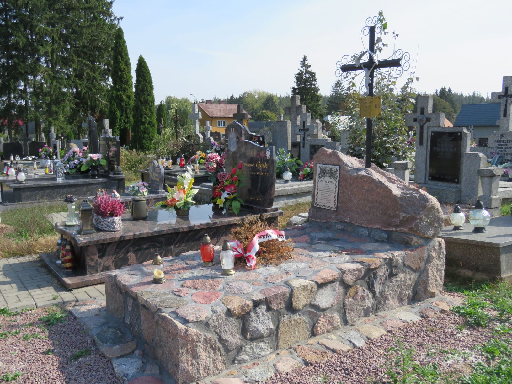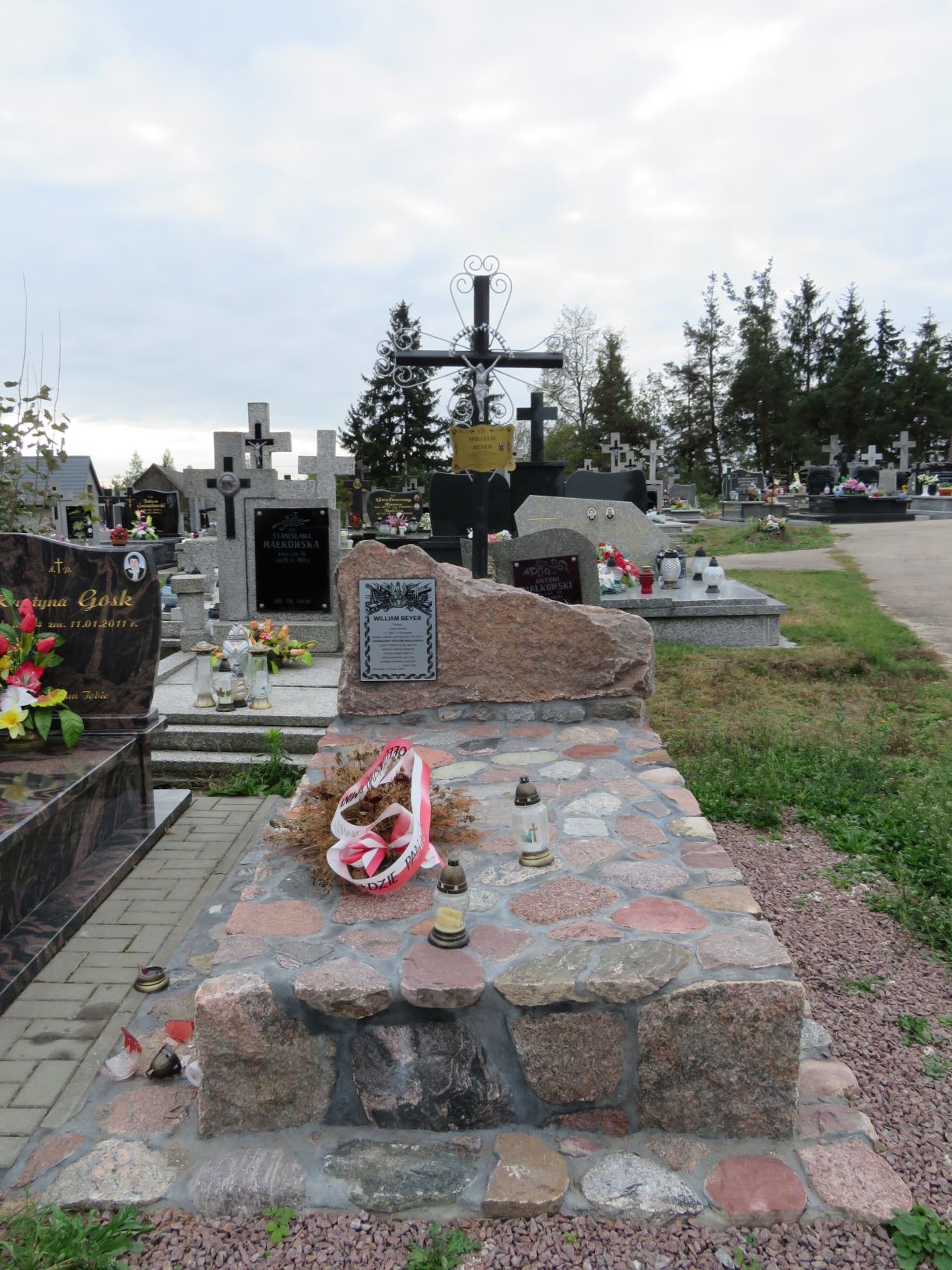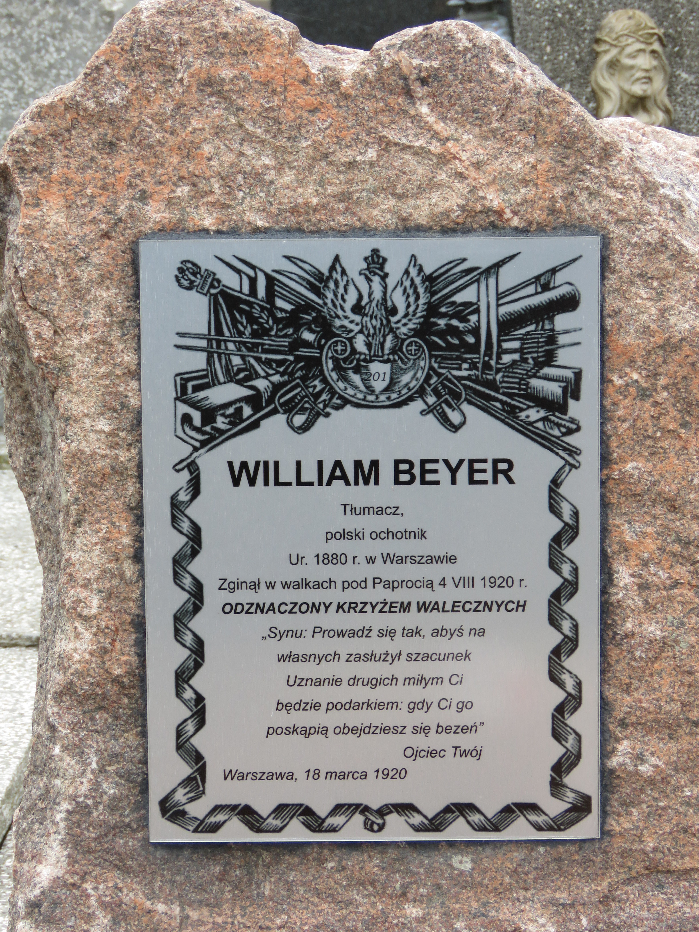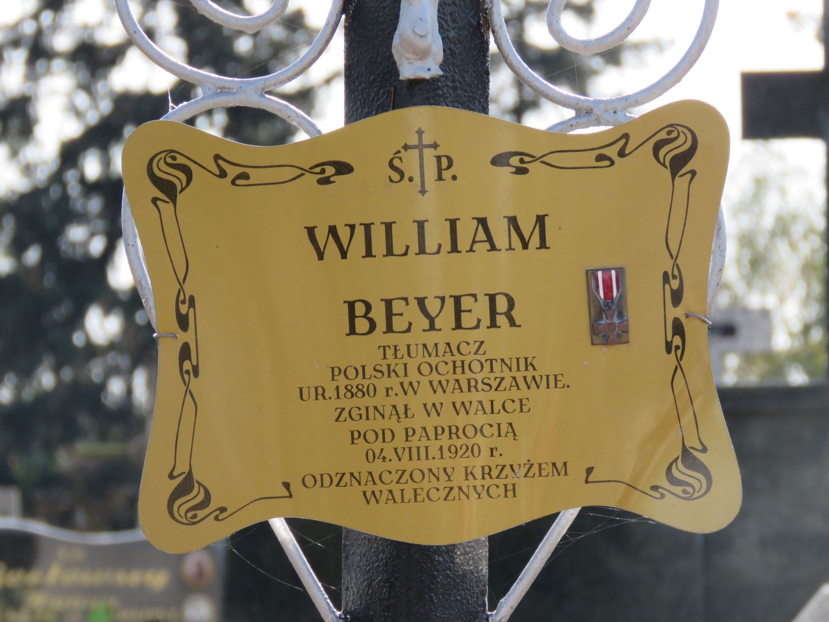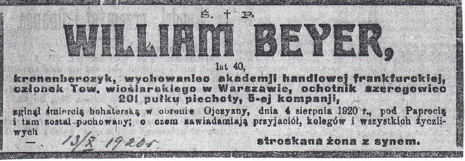 Kilka lat po zakończeniu wojny, staraniem rodziny, z mogiły zbiorowej żołnierzy II batalionu 201. Ochotniczego Pułku Piechoty poległych 4 sierpnia 1920 r. pod Paprocią Dużą i Pęchratką Polską ekshumowano ciało jednego z żołnierzy, najstarszego z poległych ochotników, czterdziestoletniego Williama Beyera. Został on pochowany w osobnym grobie znajdującym się przy głównej alei cmentarnej. O mogiłę dbają uczniowie szkoły w Szumowie, jest także odwiedzana przez członków rodziny. Mimo ponownego urządzenia grobu, napis na tablicy pamiątkowej pozostaje taki sam: WILLIAM BEYER / Tłumacz, / polski ochotnik / Ur. 1880 r. w Warszawie / Zginął w walkach pod Paprocią 4 VIII 1920 r. / ODZNACZONY KRZYŻEM WALECZNYCH / „Synu: Prowadź się tak, abyś na / własnych zasłużył szacunek / Uznanie drugich miłym Ci / będzie podarkiem: gdy Ci go / poskąpią obejdziesz się bezeń” / Ojciec Twój / Warszawa, 18 marca 1920 Informacje o życiu i śmierci Williama Beyera zawiera list jego wnuczki, Moniki Beyer, przekazany w 2005 r. do Zespołu Szkół w Szumowie. William Beyer urodził się w Łodzi w 1880 roku. Jak wskazuje jego nazwisko, rodzina była pochodzenia niemieckiego, ale przodkowie osiedlili się w Polsce już dawno, prawdopodobnie w XVIII wieku. Dziadkowi nadano tradycyjne w rodzinie imię Wilhelm, ale jako gorący polski patriota sam zmienił je na wersję angielską, stąd William. Jednym z jego przodków był Karol Beyer, także gorący polski patriota, zesłaniec, pionier polskiej fotografii, numizmatyk i archeolog. Dziadek mój studiował ekonomię w Warszawie w SGH i we Frankfurcie. Był poliglotą, władał biegle jęz. angielskim, francuskim, niemieckim, rosyjskim, włoskim, zgłębiał tajniki hebrajskiego i japońskiego. Miał także talent plastyczny, projektował reklamy do czasopism. Wyjątkowo wysportowany, został wytypowany do reprezentacji Polski na olimpiadę jako znakomity fechtmistrz. Od wczesnej młodości był zamiłowanym podróżnikiem. Przed ukończeniem 20 lat opuścił rodzinny dom i – karmiąc na statku woły – popłynął do Kanady, gdzie pracował jako drwal przy wyrębie lasów. Po ślubie z moją babcią Stefanią nadal podróżował, również po przyjściu na świat mego ojca, któremu także nadano imię William. Pracował intensywnie przez pół roku, zostawiał babci pieniądze na utrzymanie rodziny, i – ruszał w świat. Jego ostatnią zagraniczną podróżą była wyprawa do Japonii w 1918 r. Przez półtora roku mieszkał w Tokio w rodzinie japońskiej i pracował. Zachowała się z tamtych czasów jego korespondencja, a także niektóre artykuły i teksty odczytów wygłaszanych w jęz. angielskim na temat historii Polski. Przebijała z nich głęboka wiedza i umiłowanie ojczyzny. Po powrocie do kraju w 1920 roku, gdy Polsce - i całej Europie - zagrażała inwazja wojsk sowieckich, dziadek zaciągnął się do Armii Ochotniczej. Początkowo nie chciano go przyjąć, gdyż miał wtedy już (dopiero?) 40 lat. Zginął na polach Paproci i Pęchratki 4 sierpnia 1920 roku. Z relacji świadków babcia dowiedziała się, że walczył bardzo dzielnie, ale w końcu otoczyli go kozacy, strącili mu binokle i nie mogąc go pokonać w fechtunku uśmiercili strzałem w tył głowy. Początkowo dziadka pochowano w bratniej mogile, potem jednak babcia przeniosła go do osobnego grobu, tego właśnie, o który tak pięknie dba szumowska młodzież. Nie miał na sobie żołnierskiego munduru, tylko szary sweter, w którym wyruszył na wojnę. W uznaniu waleczności i bohaterskiej postawy dziadek został odznaczony pośmiertnie Krzyżem Walecznych, co w owym czasie było wielkim wyróżnieniem, rzadko przyznawanym cywilom. Dziadek William osierocił babcię i 10-letniego wówczas synka, mego tatę. Warto wspomnieć, że w owych czasach, kiedy chłopiec tracił ojca, często mężczyźni z kręgu rodziny i przyjaciół tworzyli tzw. radę familijną, wspomagającą wdowę w wychowaniu i edukacji syna. Po śmierci dziadka jednym z członków tej rady był prof. Wacław Jędrzejewicz, przedwojenny polityk i dyplomata, po wojnie wieloletni prezes Instytutu im. Józefa Piłsudskiego w Nowym Jorku, autor m.in. monumentalnej „Kroniki życia Józefa Piłsudskiego”, tamże wydanej. Pan profesor przesłał memu ojcu egzemplarz tego dzieła, który w 1978 r. zatrzymała jednak cenzura. W naszej rodzinie dziadek William był żywą legendą i pozostał nią do dziś w moim sercu. Zawsze ogromnie żałowałam, że nie miałam okazji go poznać, porozmawiać z nim, wypytać o szczegóły z jego życia. I tak mi żal, że on i jego towarzysze nie zdążyli się dowiedzieć o zwycięskiej Bitwie Warszawskiej, zwanej zarazem Cudem nad Wisłą. Zabrakło dziesięciu dni. Źródło: Małgorzata Karczewska, Maciej Karczewski, Miejsca pamięci czynu niepodległościowego na północno-wschodnim Mazowszu, Białystok 2019. Fot. © Małgorzata Karczewska