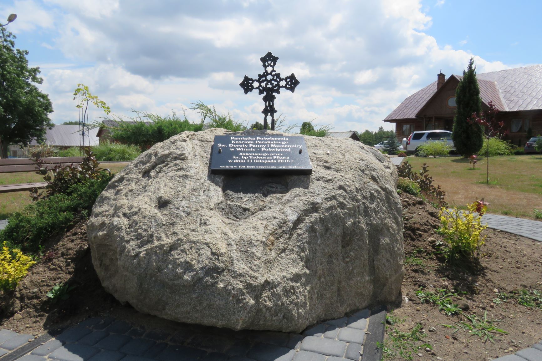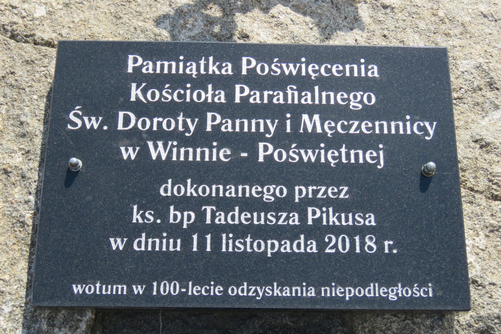 W 2018 r., po trzech latach remontu, ponownie oddano do użytku kościół parafialny w Winnie-Poświętnej, będący jednym z najstarszych drewnianych kościołów regionu. Przypadająca wówczas setna rocznica końca zaborów sprawiła, że konsekracji dokonano 11 listopada 2018 r., zaś świątynia stała się wotum za odzyskanie niepodległości. Na terenie przykościelnym ufundowany został graniowy głaz pamiątkowy z żeliwnym krzyżem i tablicą o treści: Pamiątka Poświęcenia / Kościoła Parafialnego / Św. Doroty Panny i Męczennicy / W Winnie-Poświętnej / dokonanego przez / ks. Bp Tadeusza Pikusa / w dniu 11 listopada 2018 r. / wotum w 100-lecie odzyskania niepodległości Na terenie przykościelnym znajduje się jeszcze jeden obiekt którego przekaz symboliczny jest związany z odzyskaniem niepodległości. Przy bramie prowadzącej na teren cmentarza przykościelnego wzniesiono pomnik ku czci marszałka Józefa Piłsudskiego. Popiersie o słabo zarysowanych cechach wykonano z drewna i umieszczono pod otwartą wiatą. Brak inskrypcji pamiątkowych. Wartość artystyczna rzeźby nie jest wysoka, chyba, że uzna się ją za przykład sztuki ludowej, do której przykładane są inne kryteria oceny. Źródło: Małgorzata Karczewska, Maciej Karczewski, Miejsca pamięci czynu niepodległościowego na północno-wschodnim Mazowszu, Białystok 2019. Fot. © Małgorzata Karczewska